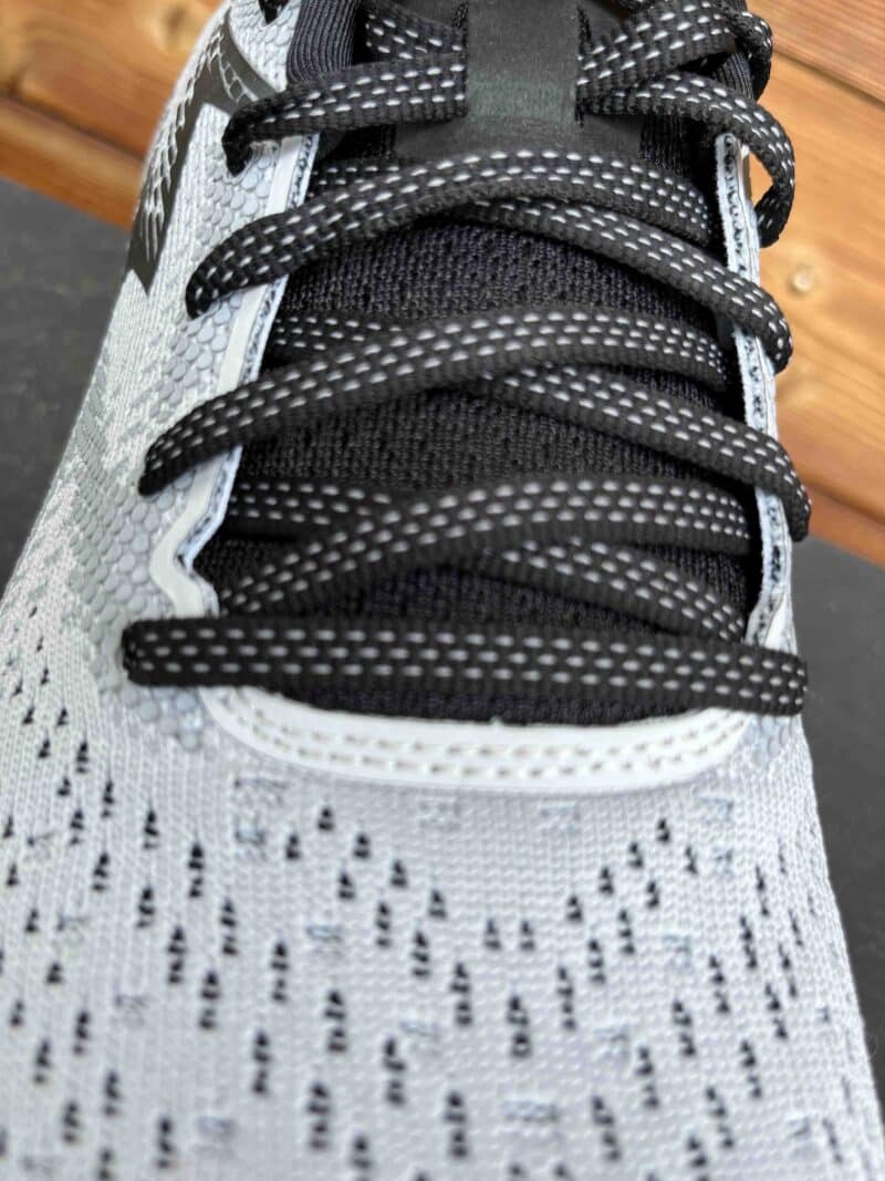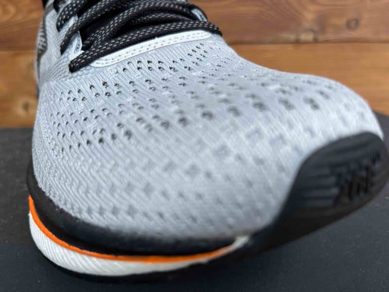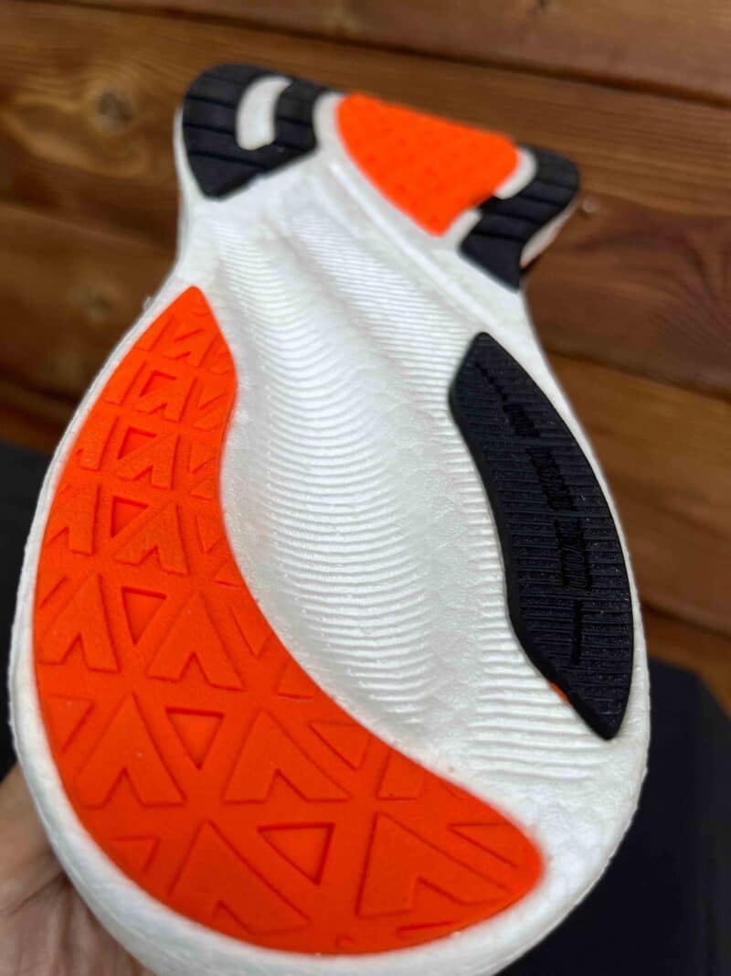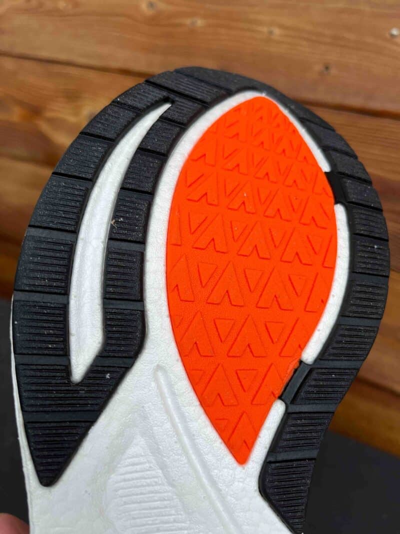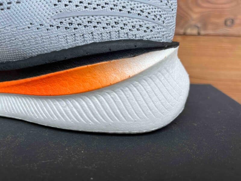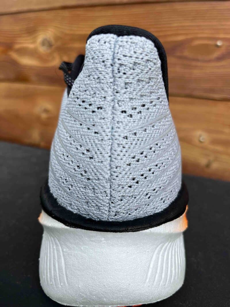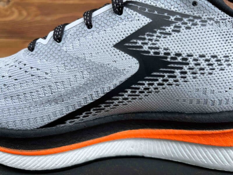 Commençons par le travail accompli sur la semelle. On découvre un amorti très présent mais doublé d’une belle réactivité : l’effet « pop » est présent. Elle nous a évoqué la semelle de l’Asics Gel-Nimbus 25 avec un peu moins de roulis et de moelleux.
