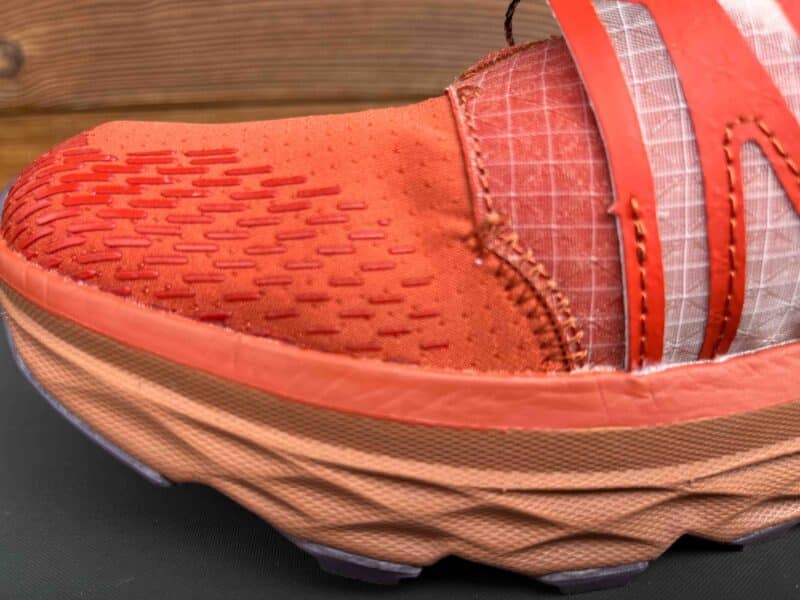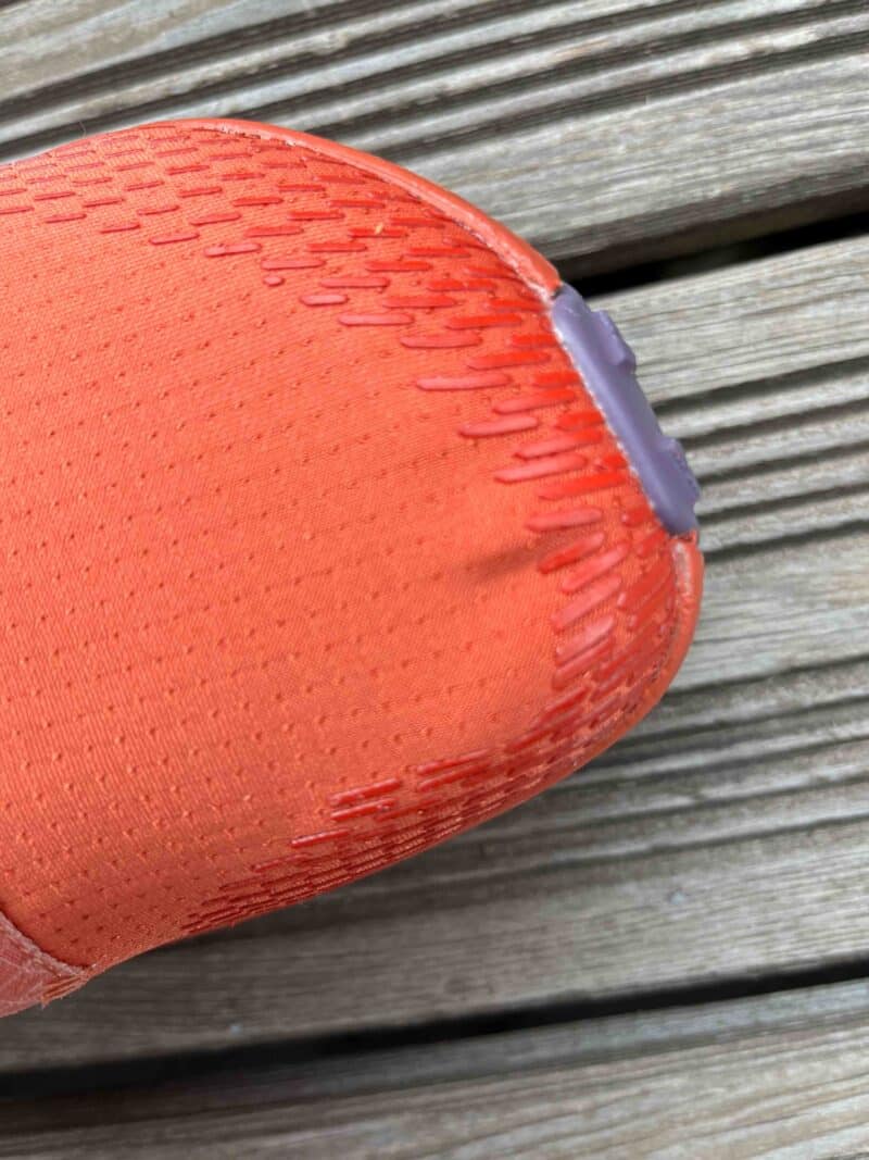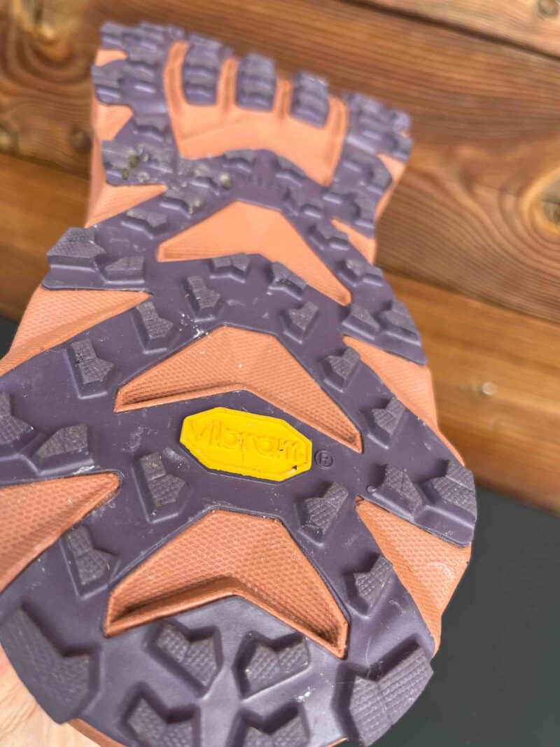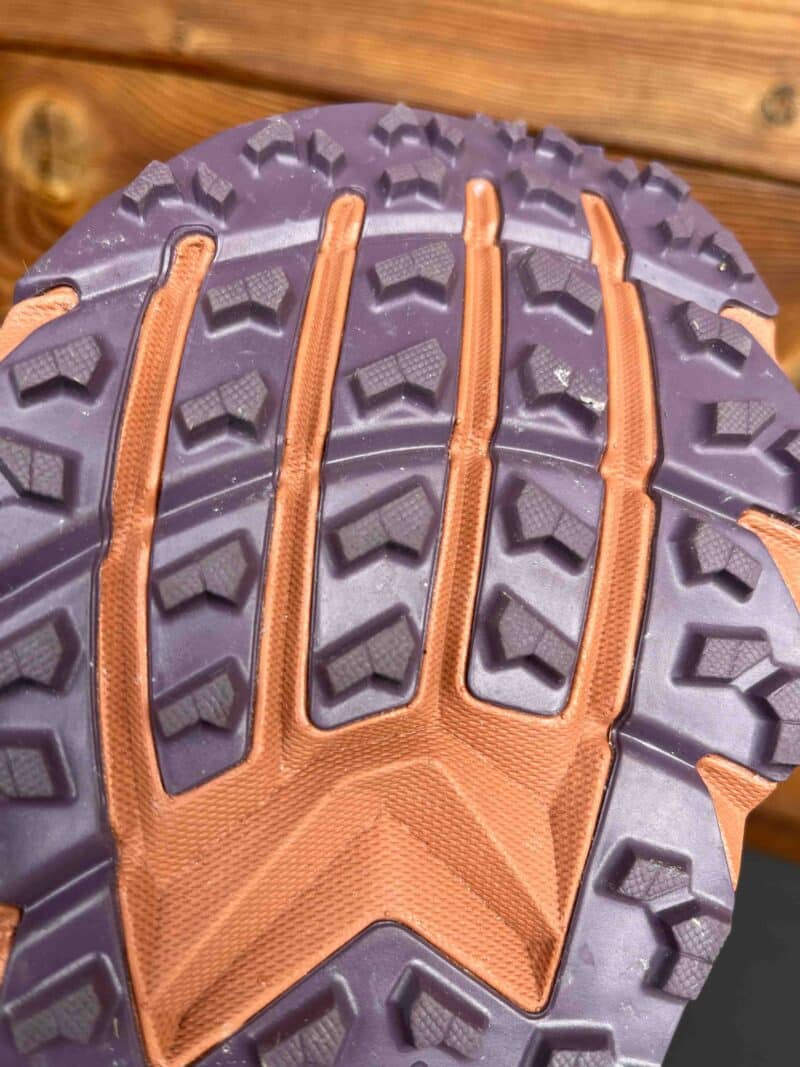 Nous avons été surpris tout de même, vu son programme Trail clairement affiché, du manque de protection de l’avant pied : pas de pare pierres. Le tissu nous semble bien léger également… Le poids (une conséquence de la fabrication light ?) est tout à fait contenu : 280 grammes en taille 42,5. Le grip de la semelle est bon, il est plutôt conçu pour les parties roulantes. La semelle ne sature pas en boue.