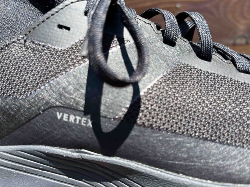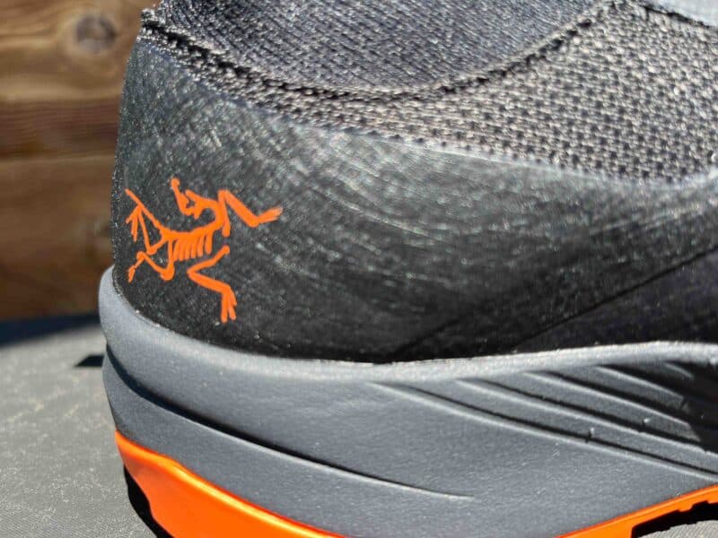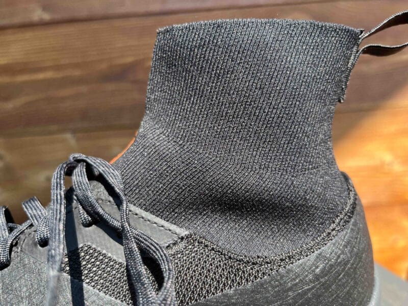 La chaussure Arc’Teryx Vertex est munie d’une guêtre très confortable, très protectrice contre les intrusions. Elle est souple et se fait oublier, le chaussage est également aisé car la matière accompagne le mouvement. Une petite sangle à l’arrière du pied facilite la manœuvre.