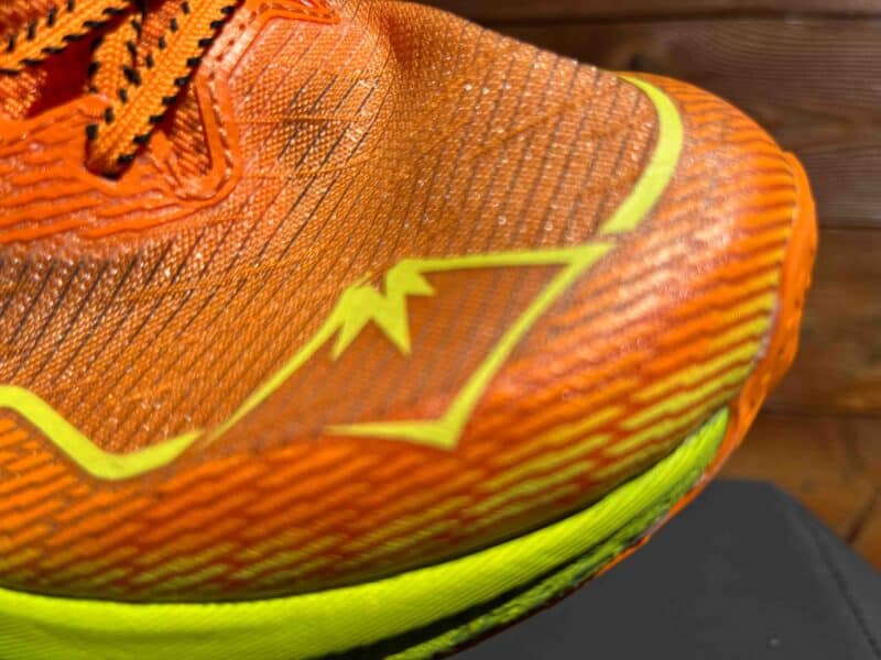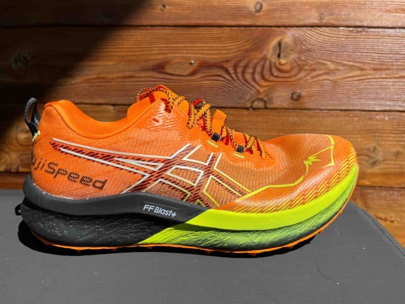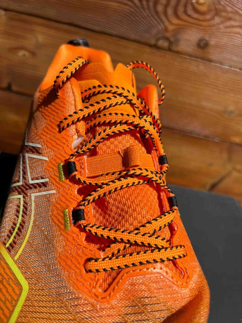 L’Asics Fujispeed 2 revient avec une nouvelle mousse, une plaque carbone, une languette retravaillée et un mesh qui semble tout à fait solide et devrait limiter l’usure prématurée notée sur quelques modèles de trail Asics (problèmes récurrents également au niveau de la semelle).