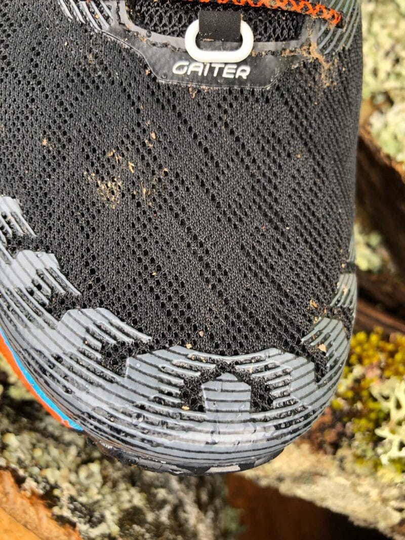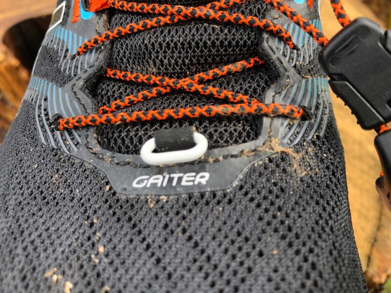 À la descente, là encore, elle répond présent avec une faculté à gommer les terrains techniques. Même si elle est haute, si elle possède un roulis minimal, on conserve une bonne pose du pied sans risques pour les chevilles. Son drop est de 5 millimètres (23 devant, 28 derrière). Le pied ne glisse pas, la conjonction d’un bon enveloppement et d’un laçage automatique (et rapide) puissant expliquent sans doute cela. Attention à ne pas trop tirer sur l’imposante languette car ses bords sont fragiles, ils peuvent se déchirer. Une large pochette permet de ranger le surplus de lacet, on aurait bien vu un rabat plus profond ou un élastique plus puissant.