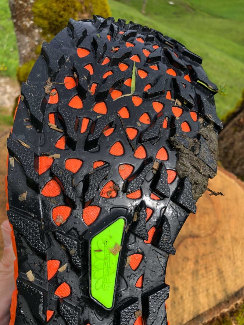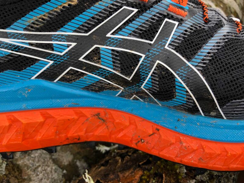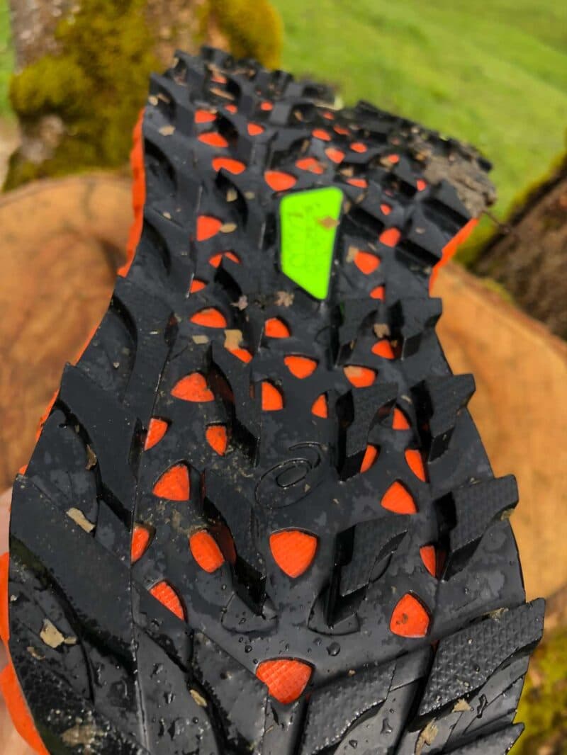 Le shape de la semelle de l’Asics Trabuco Max permet une bonne bascule du pied sur l’avant. Le grip incisif répond présent dans nombre de situation. L’avant du pied est mordant et la tenue à la descente très bonne.