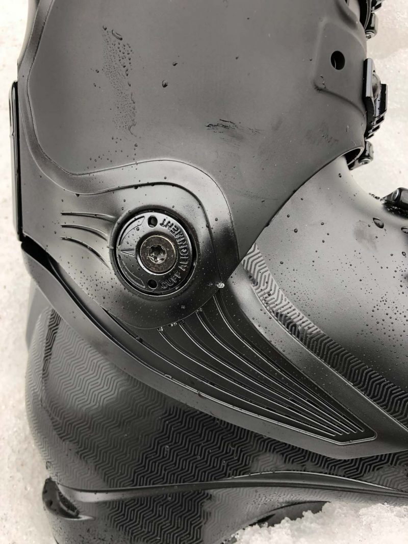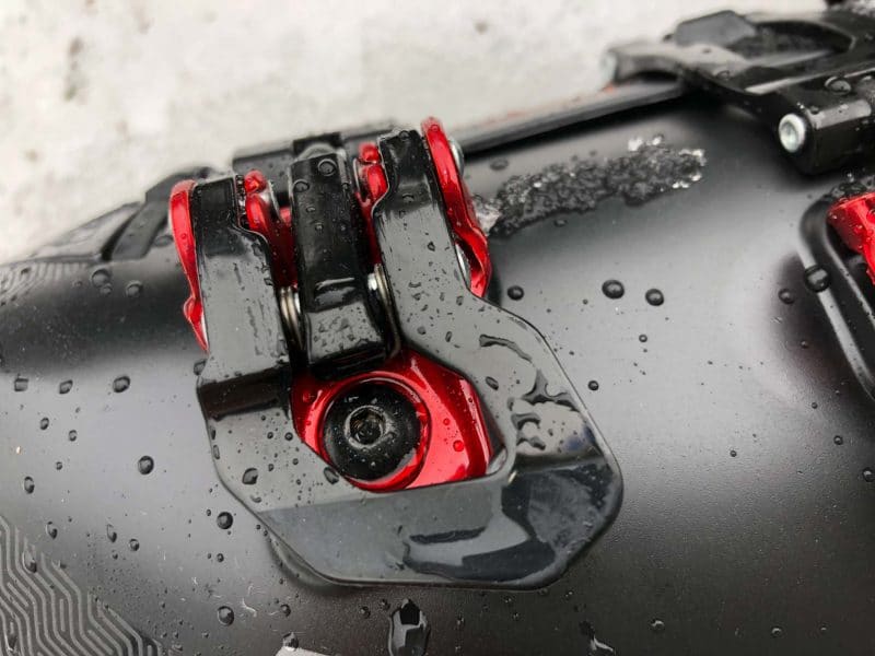 On note deux sangles, une sur la languette, l’autre sur l’arrière du chausson pour faciliter le chaussage. En talon, on peut régler l’inclinaison avant arrière et il y a bien entendu un canting.