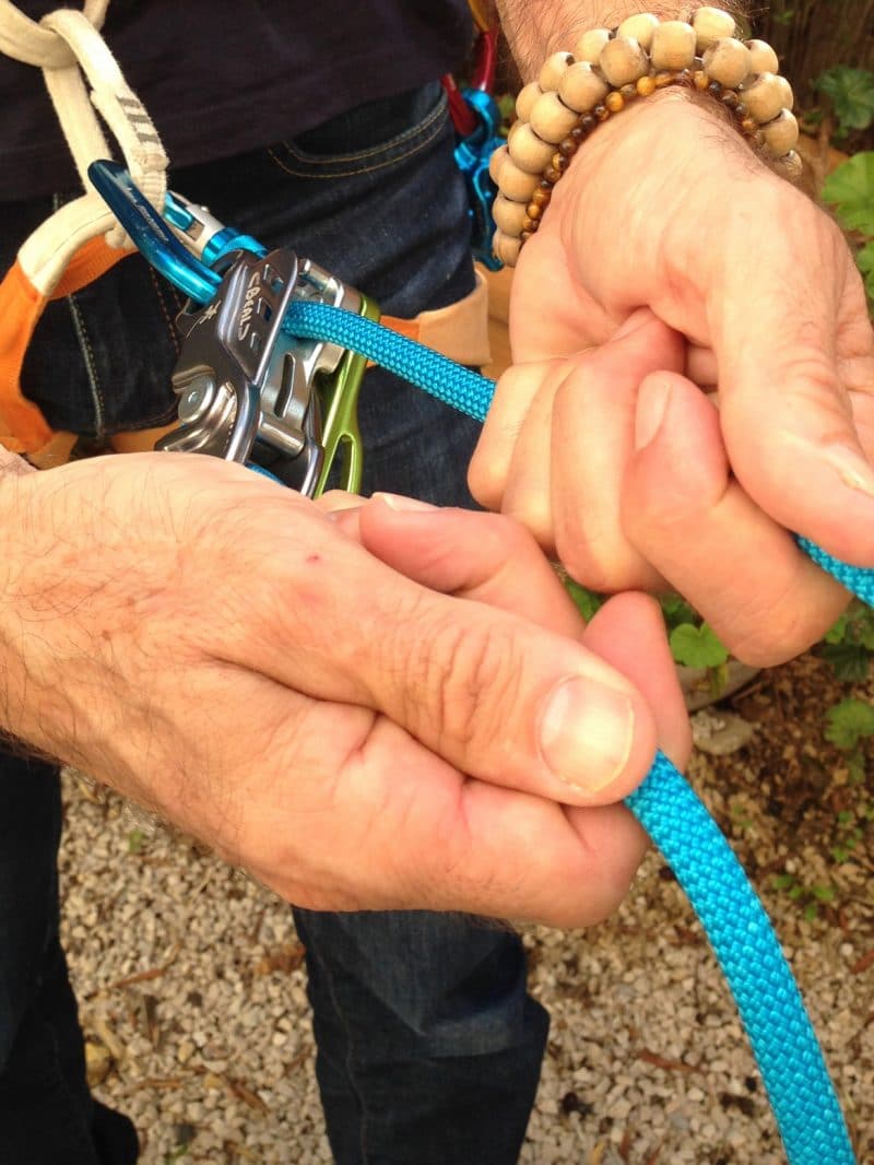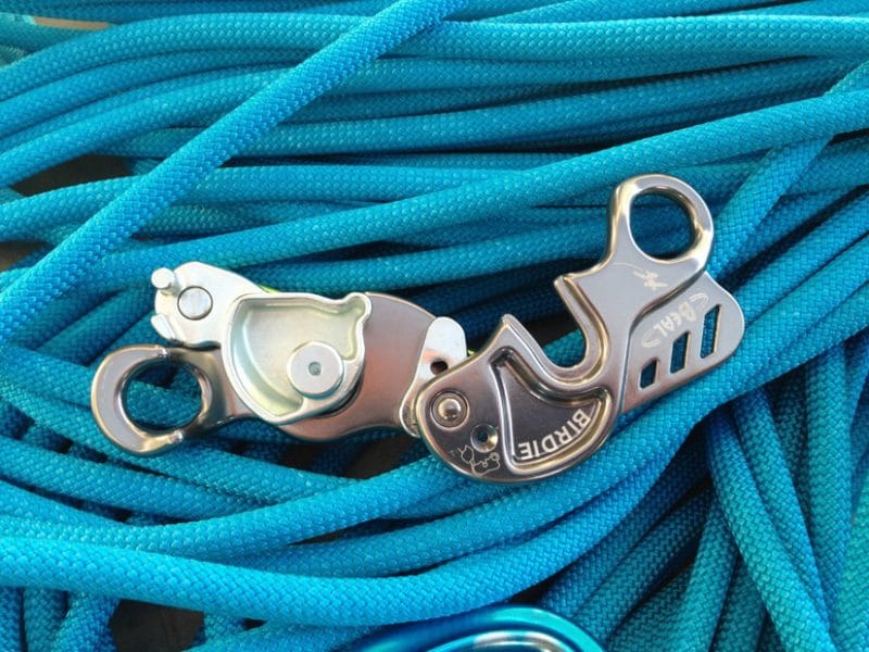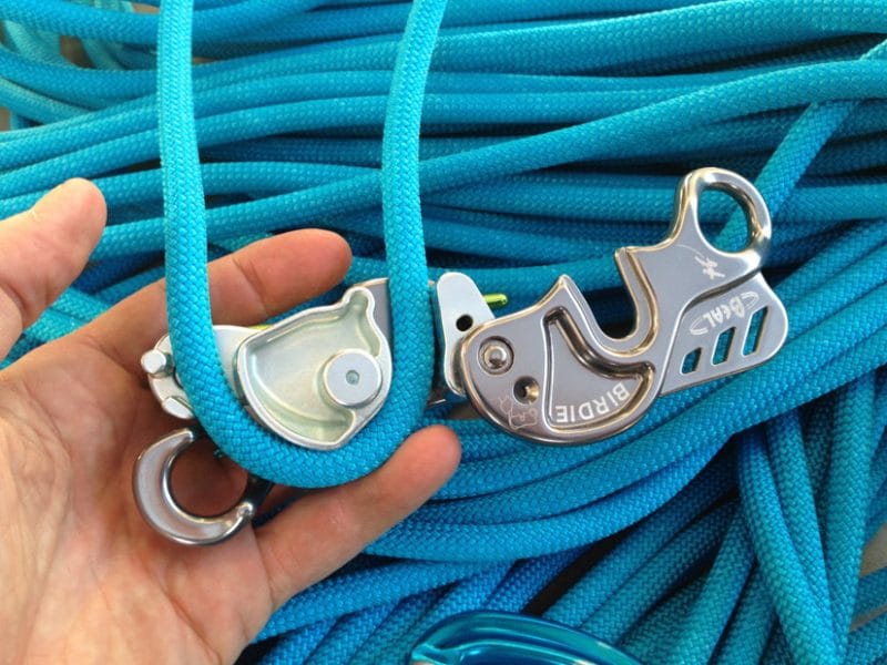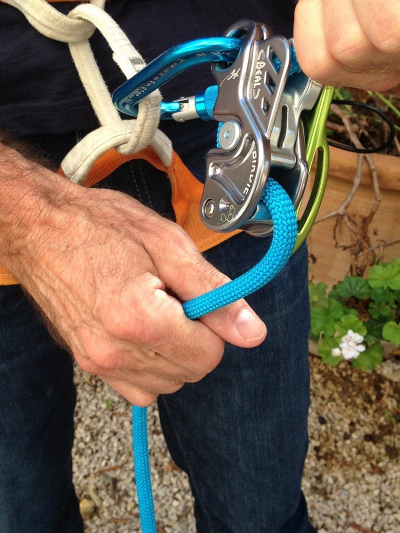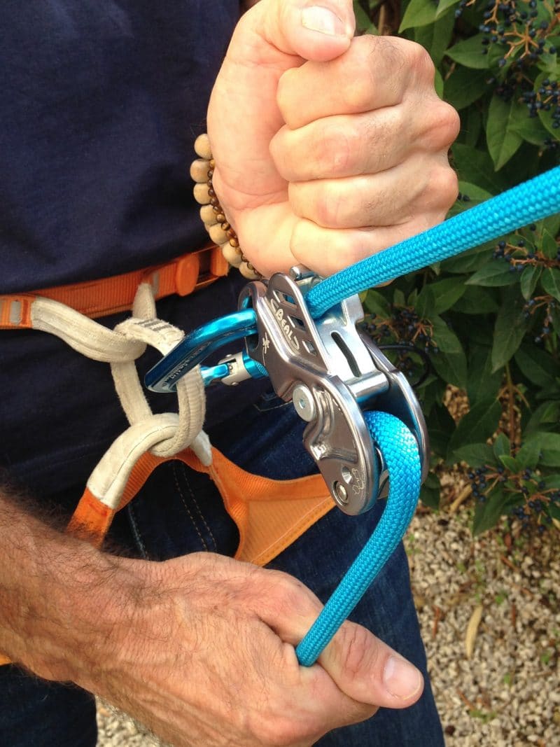 Avec la 8,5 mm on donne très facilement du mou, la fluidité de la corde fait que le système se déclenche très peu de manière intempestive au moindre à-coup. Avec la 9,8 mm, il faut anticiper un peu et garder les cordes bien parallèles au moment de donner du mou, ce qui demande d’avoir un peu d’expérience dans l’utilisation de ce type d’appareil. Dans les deux cas, l’ensemble reste fluide, fonctionne bien.