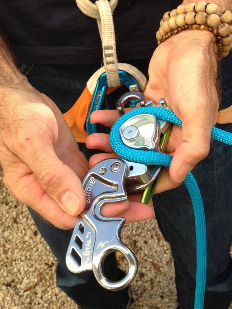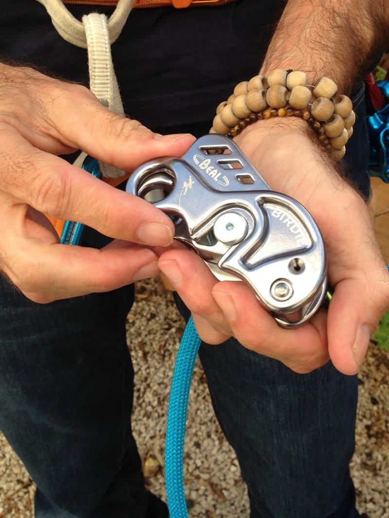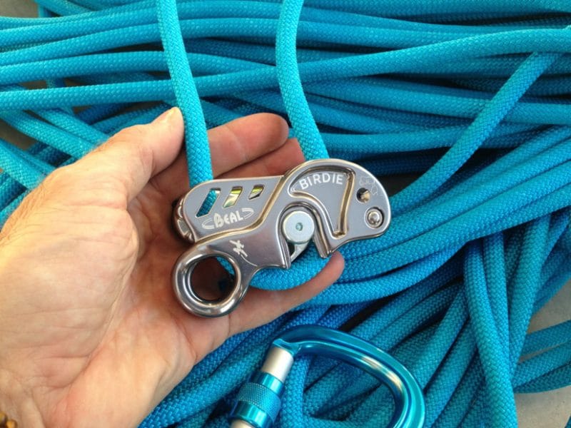 Pour le Birdie, première prise en main, il est très compact, très agréable, bien usiné, fabriqué en acier inox pour les parties les plus soumises aux frottements, et en aluminium pour le reste. On sent que c’est du costaud, qu’il a été conçu pour un usage intensif, pour durer dans le temps. Mais la contrepartie de ce choix de fabrication, c’est qu’il est un peu plus lourd que ses concurrents. Ceci étant, le poids reste surtout un critère en grande voie ou en montagne, pas en couenne ou sur mur.