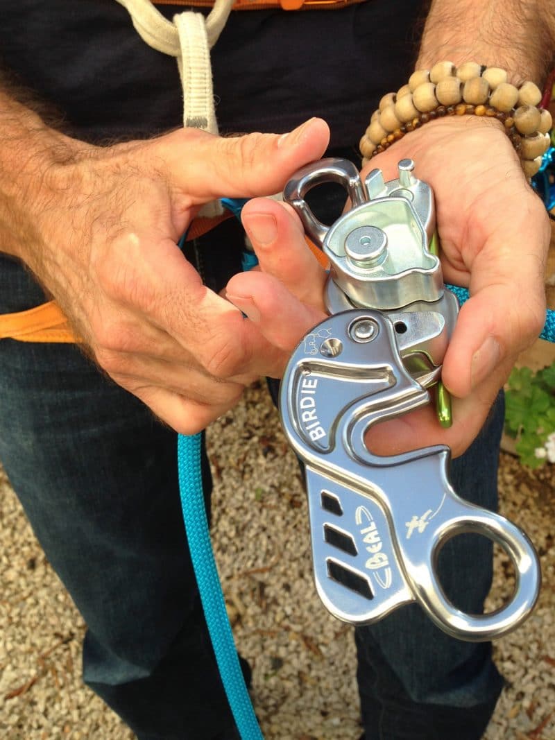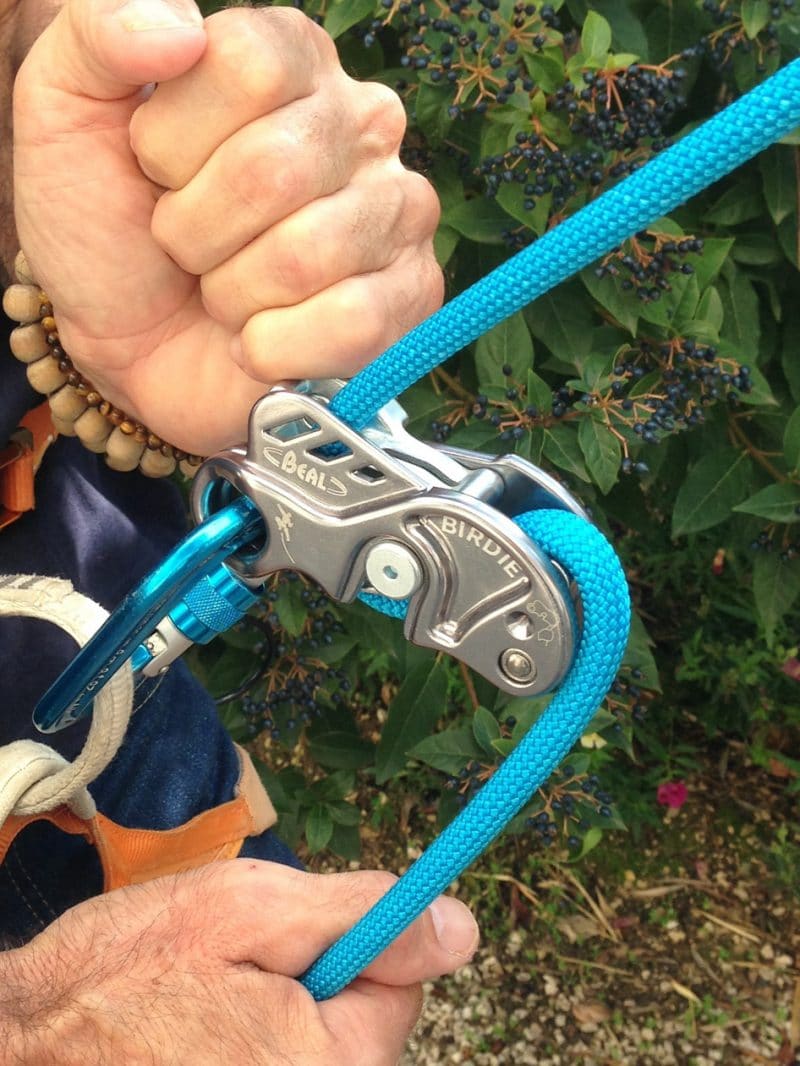 Côté blocage en cas de chute, le Béal Birdie est très réactif et quel que soit le diamètre de la corde, il déclenche parfaitement. Par contre, il n’y pas de système anti-panique, tout en sachant quand même que le système d’auto-blocage fonctionne dans la quasi-totalité des cas, qu’il n’est défaillant que dans des configurations très particulières et rares.