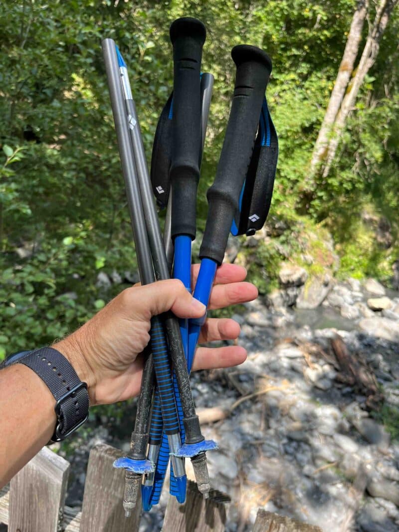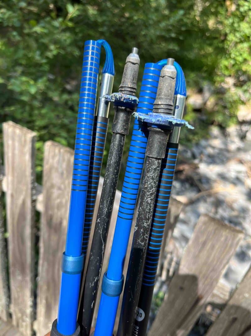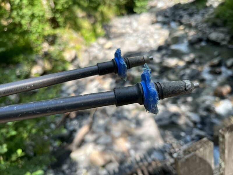 La pointe du Black Diamond Carbon Z est très bonne. Nous avons utilisé les petites rondelles qui s’érodent rapidement dans les pierriers. On peut les changer pour des modèles plus larges (inclus), de type « ski ». Ces dernières rondelles restent d’une surface peu importante.