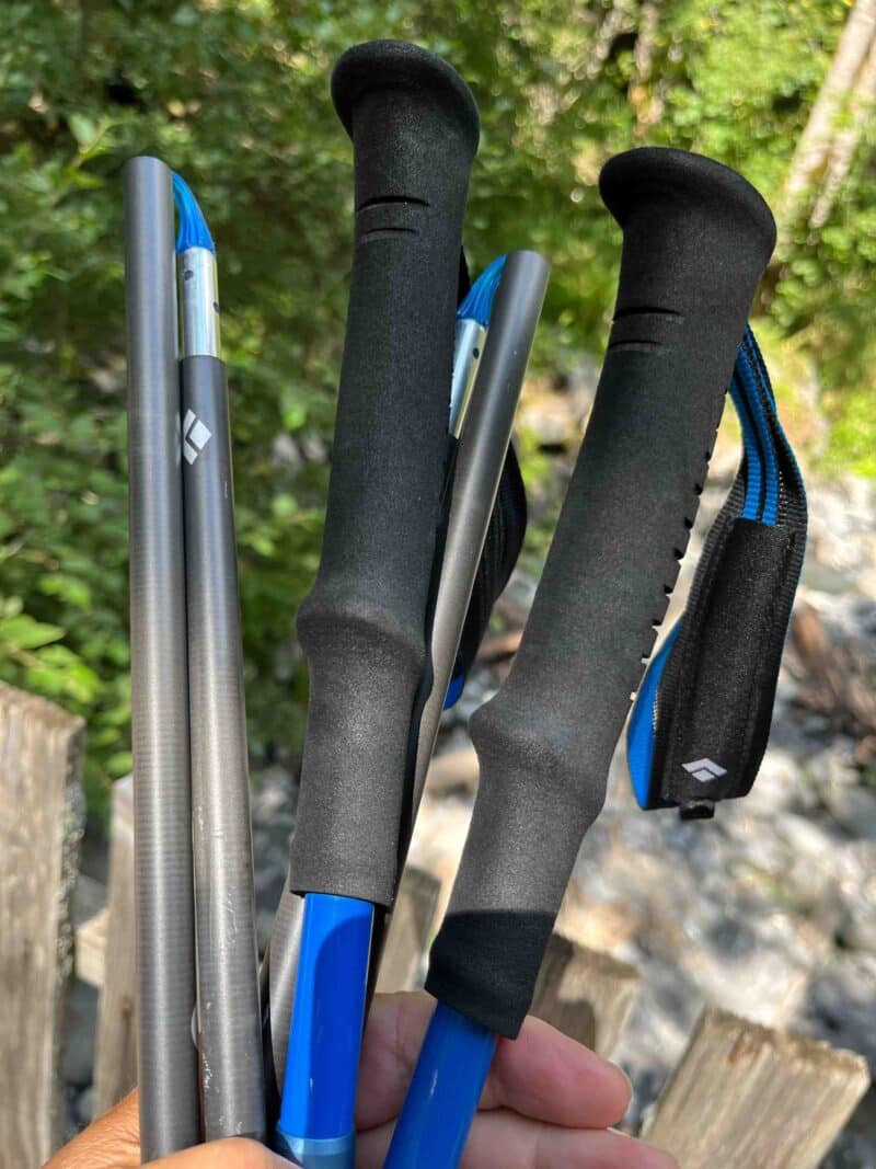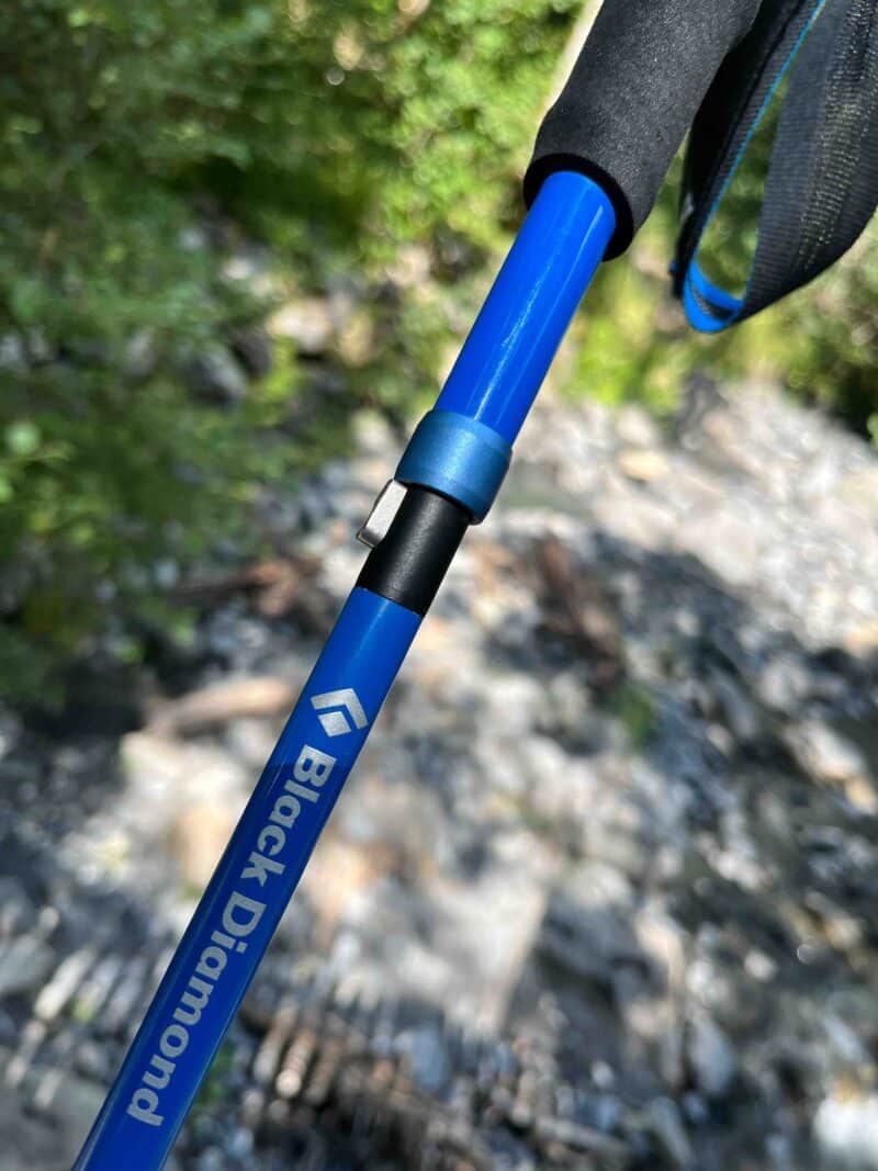 Les Black Diamond Carbon Z sont constitués de trois brins carbon. Premier constat : on ne se met pas d’échardes de carbon dans les doigts lors du montage. Pour les monter, il suffit de tirer (assez fort) sur la poignée et le premier brin. On note que Black Diamond a disposé des spires sur le premier brin qui empêchent la main de glisser (moins évident avec certains gants). Elles servent également à la montée en dévers lorsque l’on n’a pas la main sur la poignée. La très bonne idée concerne la pièce métallique de blocage qui est de forme allongée : on peut donc, pour démonter les Black Diamond Carbon Z, appuyer dessus et ne pas se coincer la pulpe des doigts comme c’est si souvent le cas sur les autres bâtons !