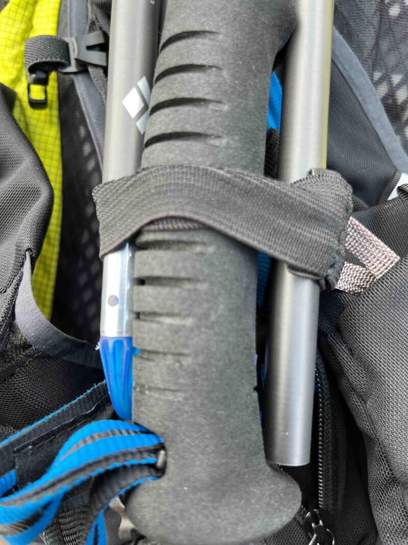 Les Black Diamond Carbon Z sont livrés avec deux bandes velcro pour le transport. Si le maintien est efficace et relativement pratique (il faut les mettre dans le bon sens), on préfère un carquois en tissu ultra light à l’image de celui d’Evadict.