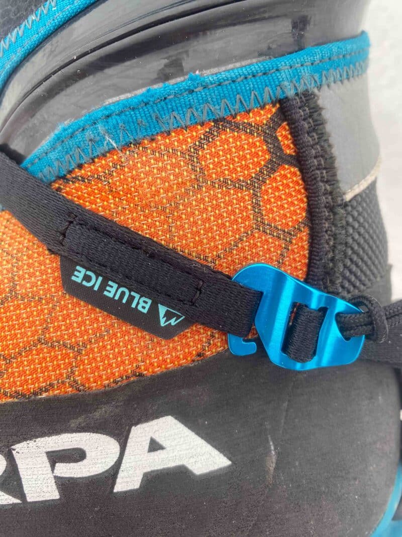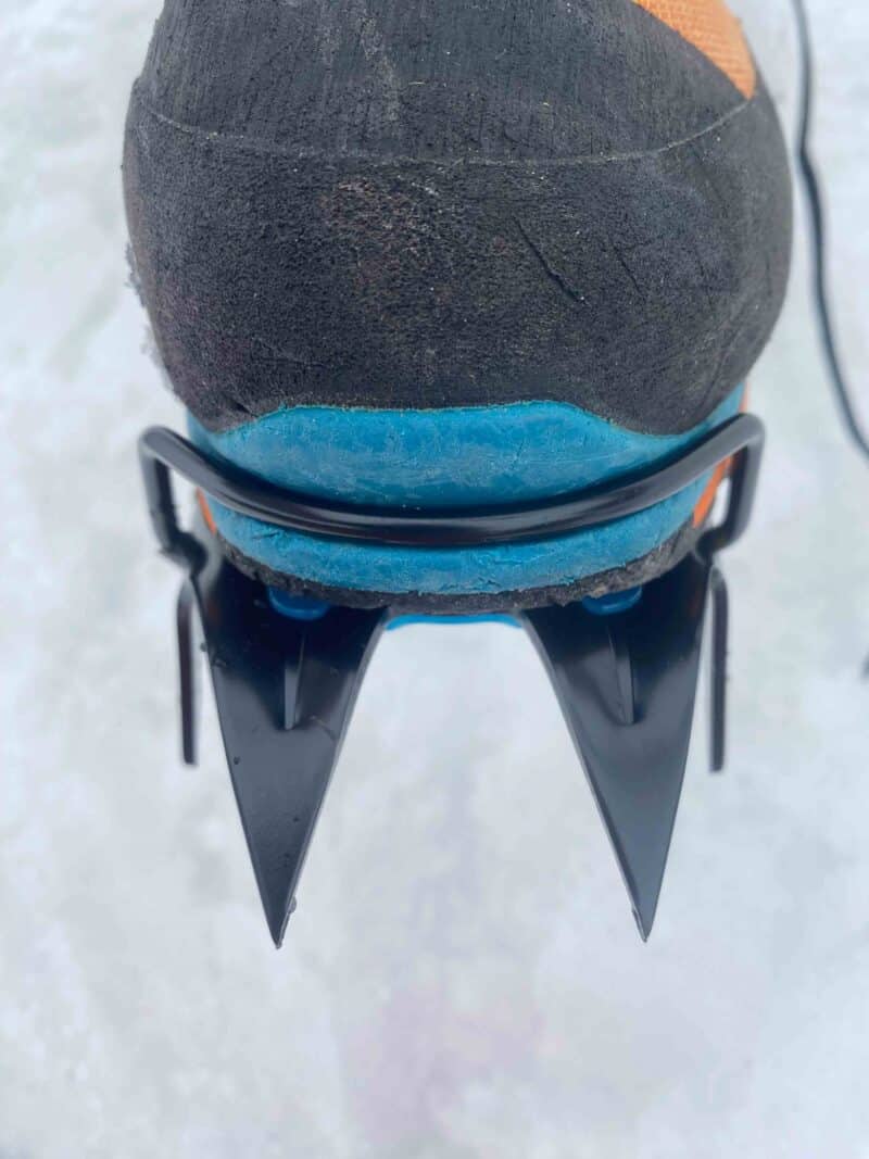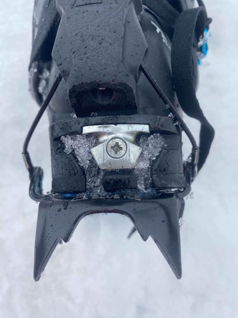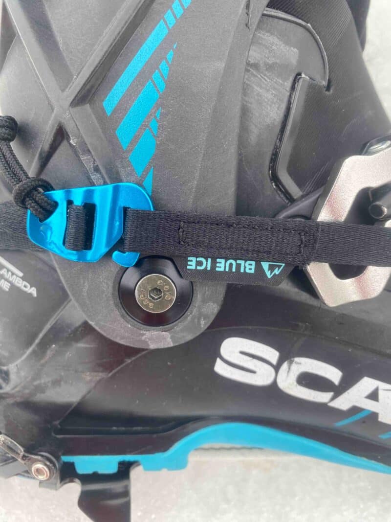 Pour les petites tailles (38 femme par exemple), la base arrière (talon) est assez volumineuse d’où l’importance du réglage et la tension de la sangle. Pour les tailles les plus grandes nous avons testé avec une chaussure de randonnée à ski de taille 48. C’est le maximum du maximum. On pensait aussi qu’en ne faisant pas le retour de sangle on pouvait gagner quelques centimètres, et bien non. La sangle ne se verrouille pas et le crampon se desserre. Pour éviter se genre de désagrément, Blue Ice vend séparément une sangle plus grande pour les plus grands pieds.