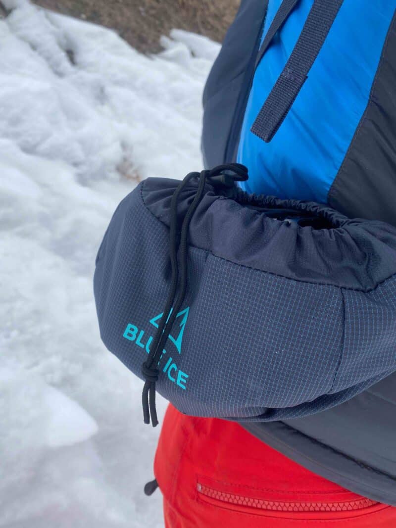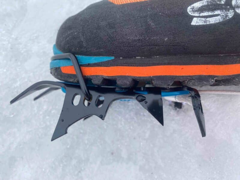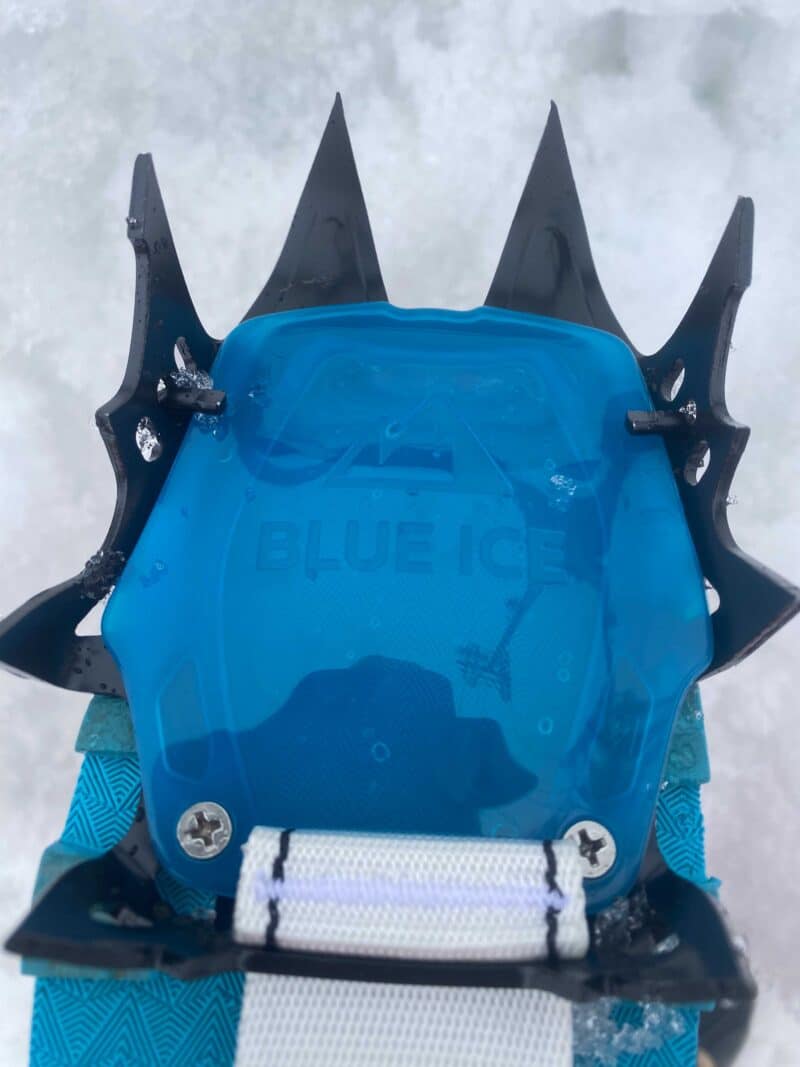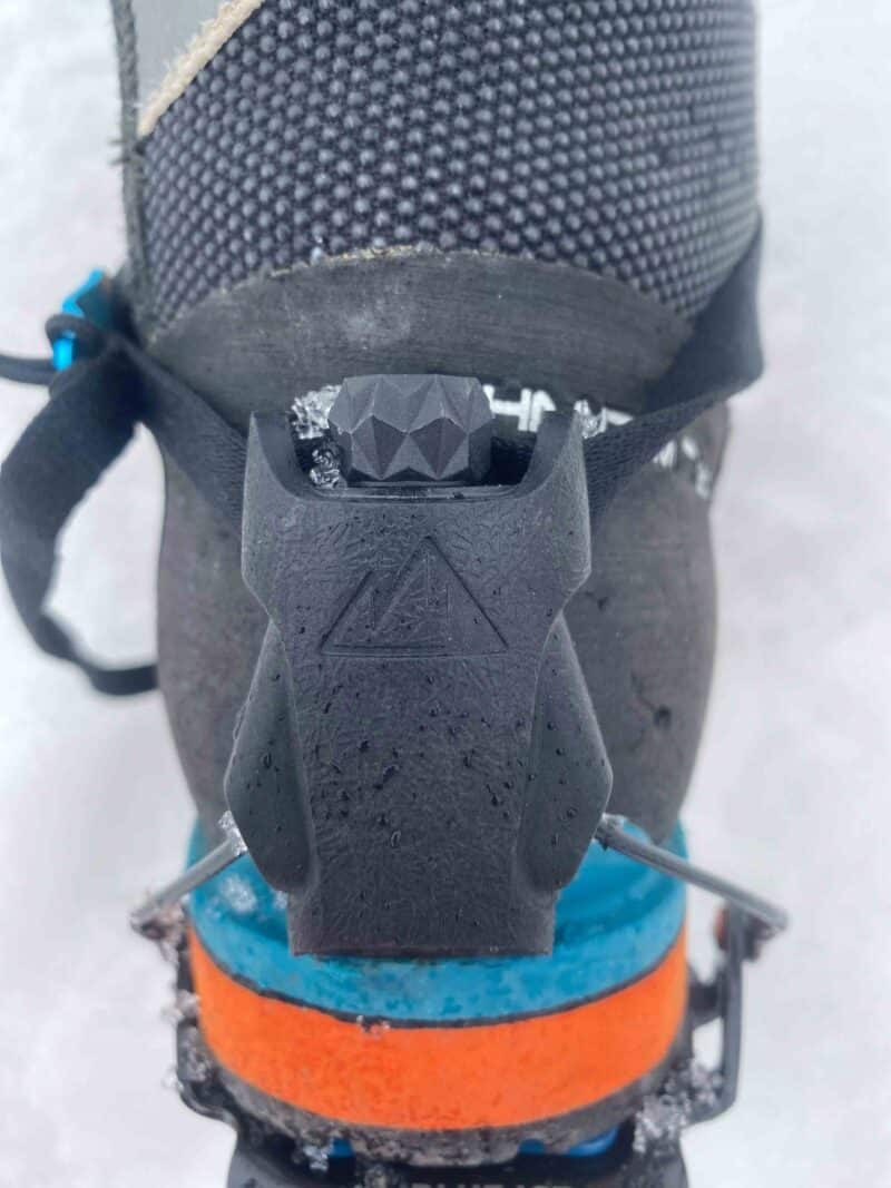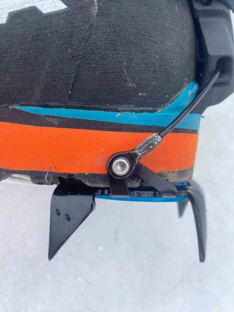 Pour les petites tailles (38 femme par exemple), la base arrière (talon) est assez volumineuse d’où l’importance du réglage et la tension de la sangle. Pour les tailles les plus grandes nous avons testé avec une chaussure de randonnée à ski de taille 48. C’est le maximum du maximum. On pensait aussi qu’en ne faisant pas le retour de sangle on pouvait gagner quelques centimètres, et bien non. La sangle ne se verrouille pas et le crampon se desserre. Pour éviter se genre de désagrément, Blue Ice vend séparément une sangle plus grande pour les plus grands pieds.
