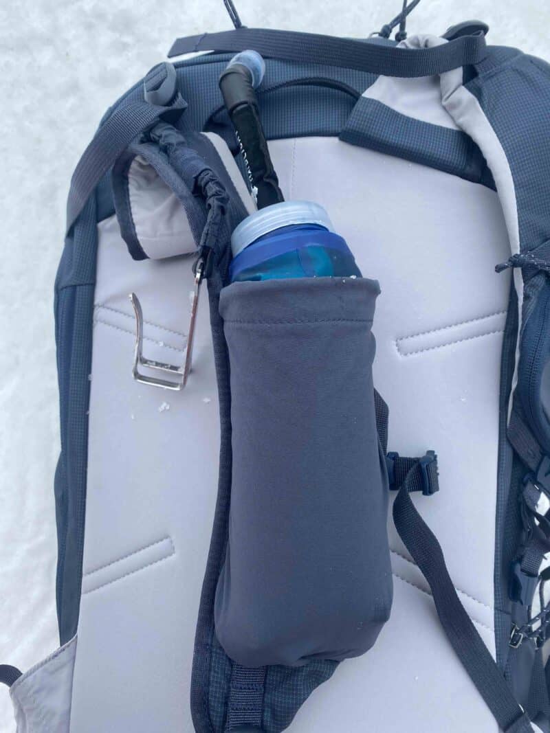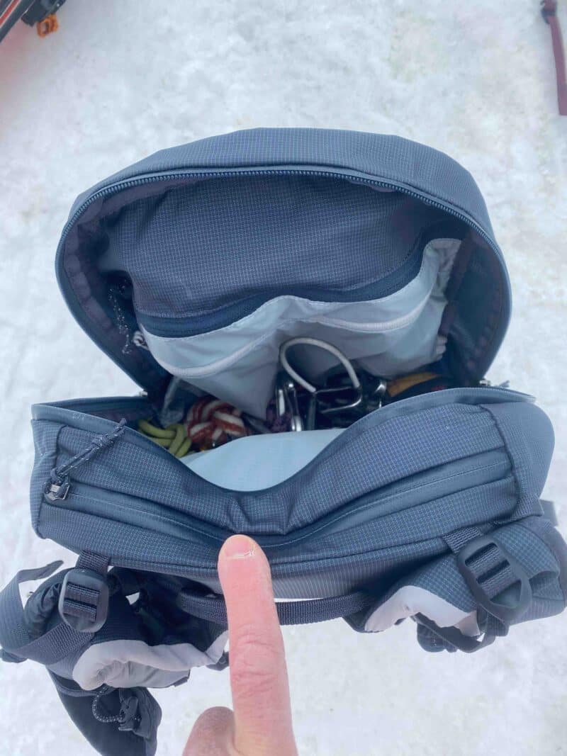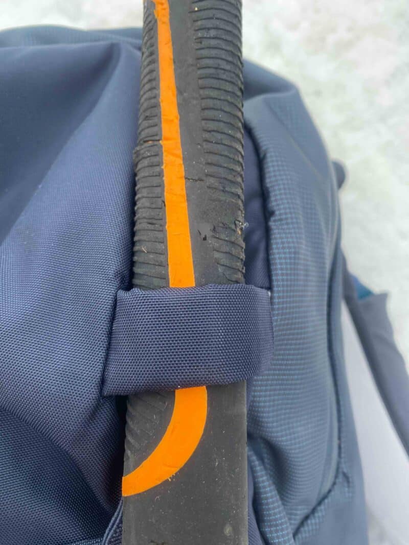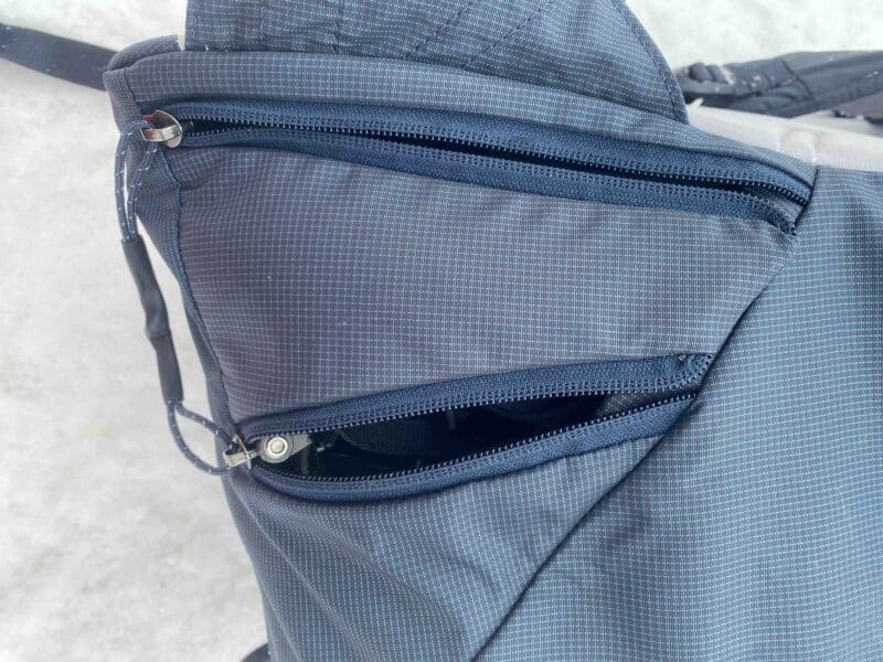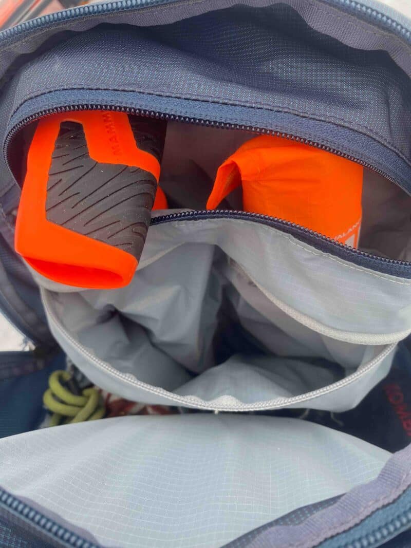 On trouve une poche sécurité avalanche dédiée à la pelle et la sonde. Suivant le type de matériel de sécurité que l’on a, les testeurs ont trouvés que le zip aurait pu être plus grand afin de faciliter l’accès à l’équipement. Nous avons aussi trouvé que la profondeur était un peu juste et qu’une fois que tout était en place (pelle et sonde, il était mal commode de placer le rabat. Une autre poche est accolée à la « poche sécurité ». On pourrait la nommer la « poche eau » puisqu’elle est compatible avec système d’hydratation…