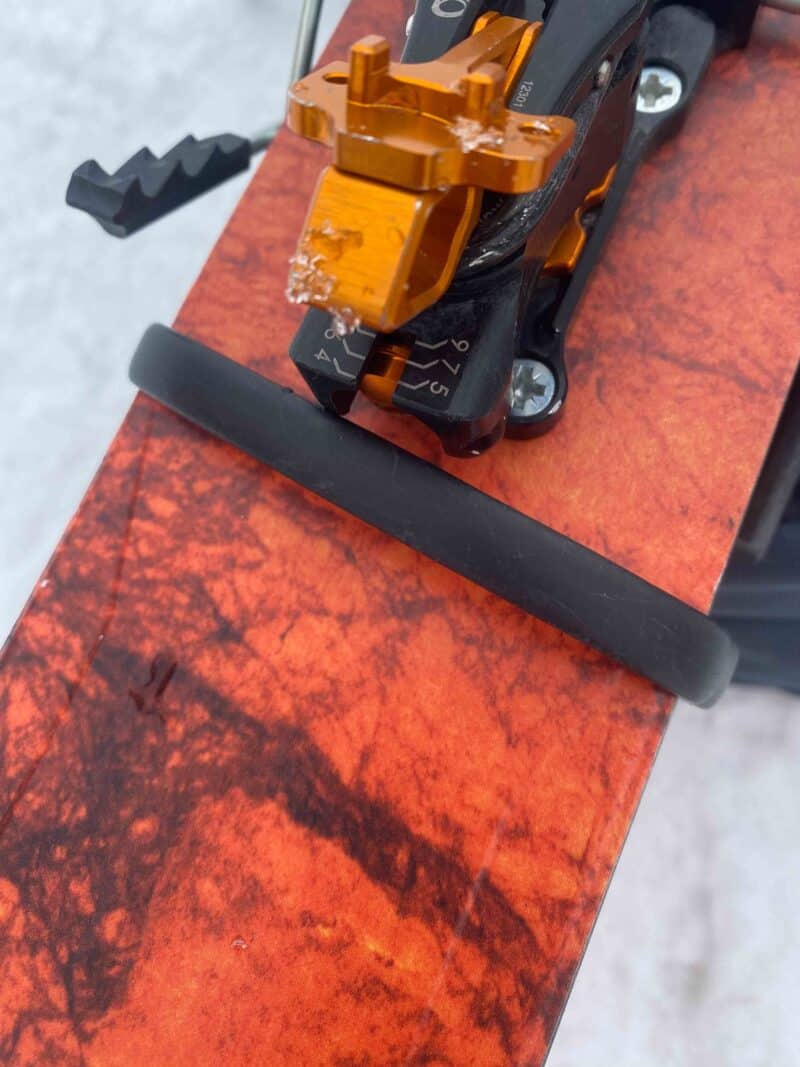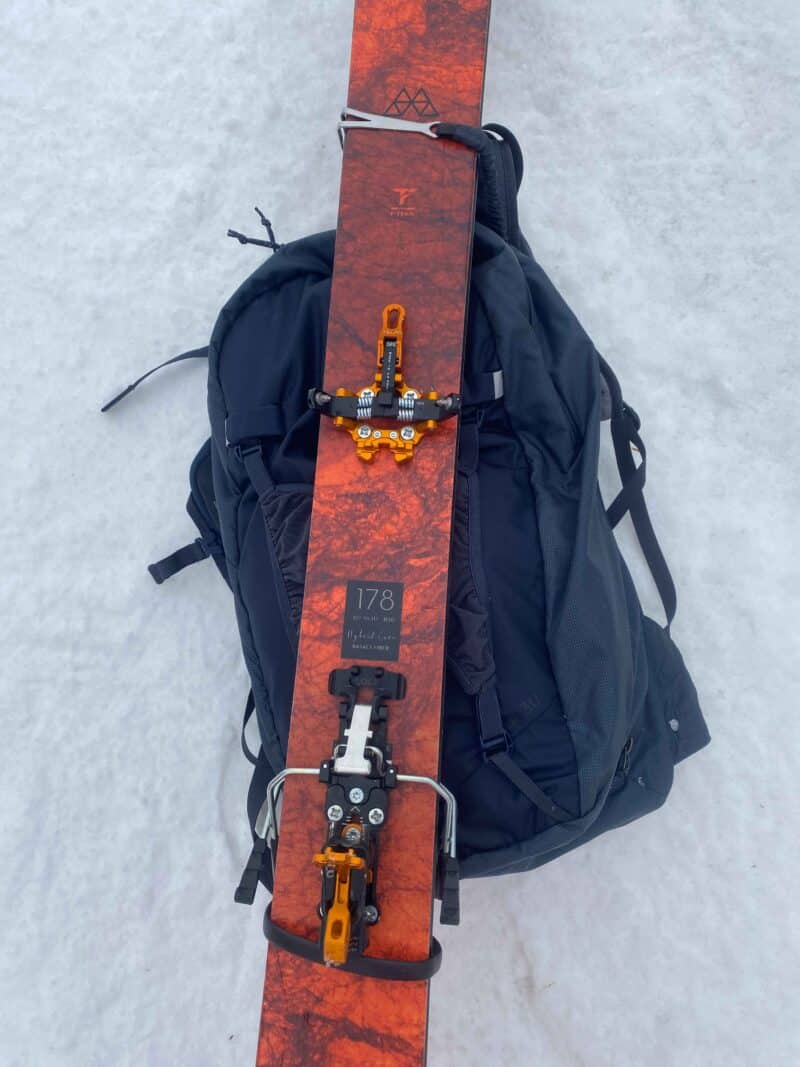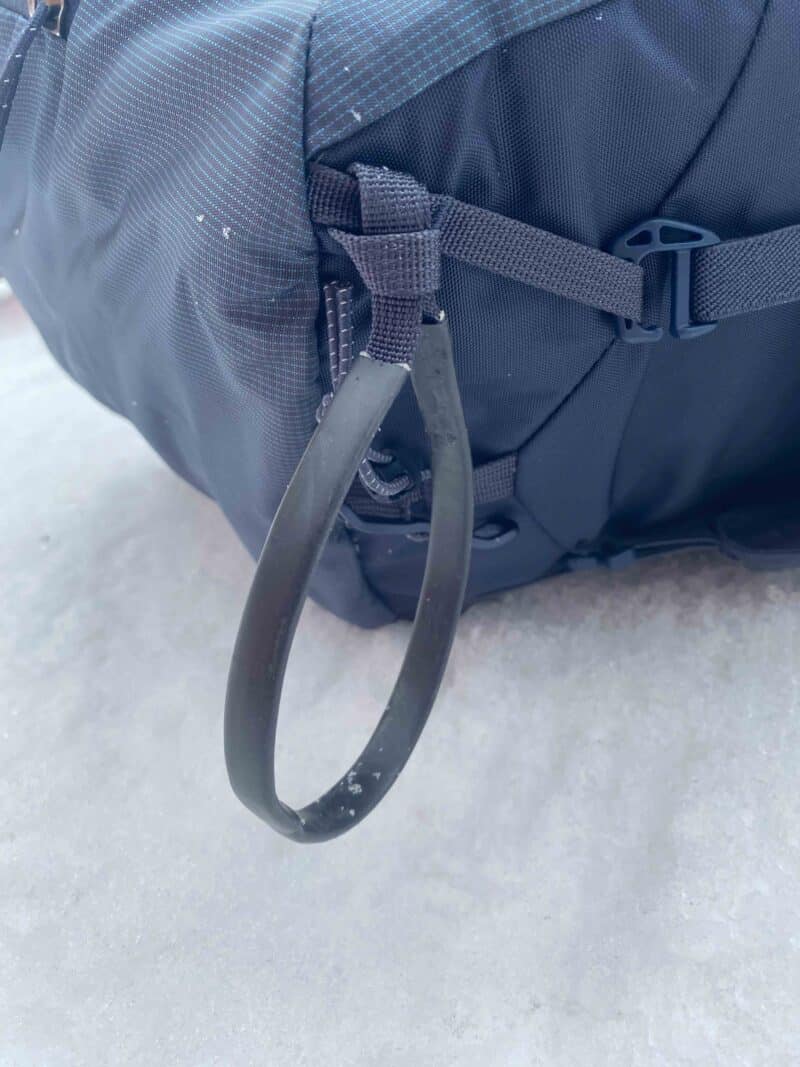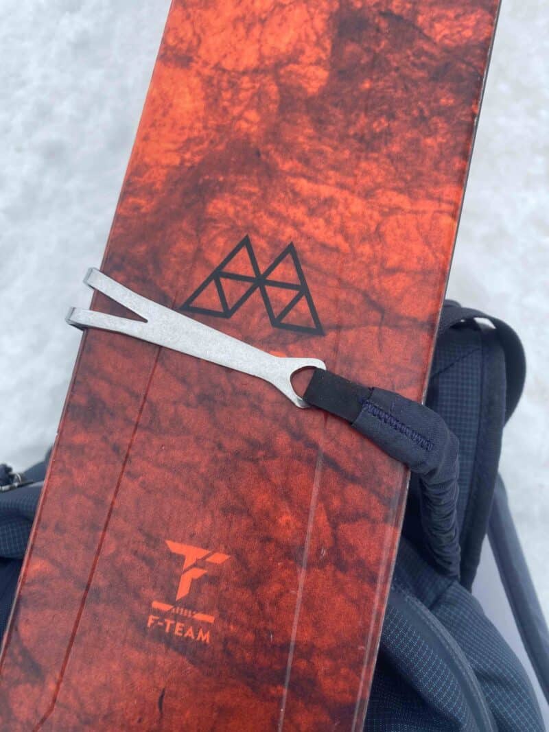 Le système de portage rapide pour les skis a été pensé aussi pour les skis plus larges. Nous avons facilement glissé nos 99 mm en patin. Ce système de type « Skimo » est muni d’un crochet amovible sur l’une des bretelles et d’un anneau renforcé en contre-bas.