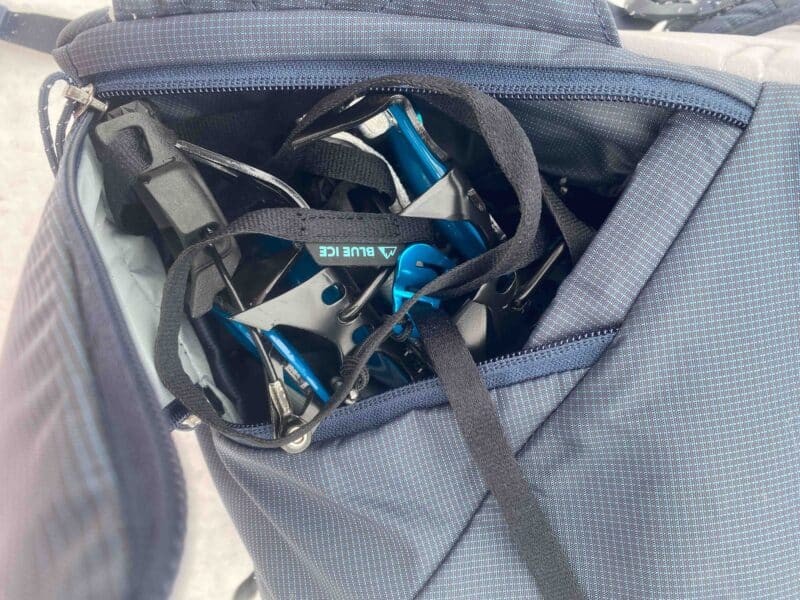 Sur la partie basse du Taka, on note une poche pour crampons légers type Harfang Alpine de chez Blue Ice, ceux qui peuvent se replier sur eux-mêmes. Les crampons classiques n’entrent pas. Cette poche aussi est accessible sans quitter le sac. Deux zips reliés par une sangle ainsi qu’un aimant facilitent l’ouverture et la fermeture.