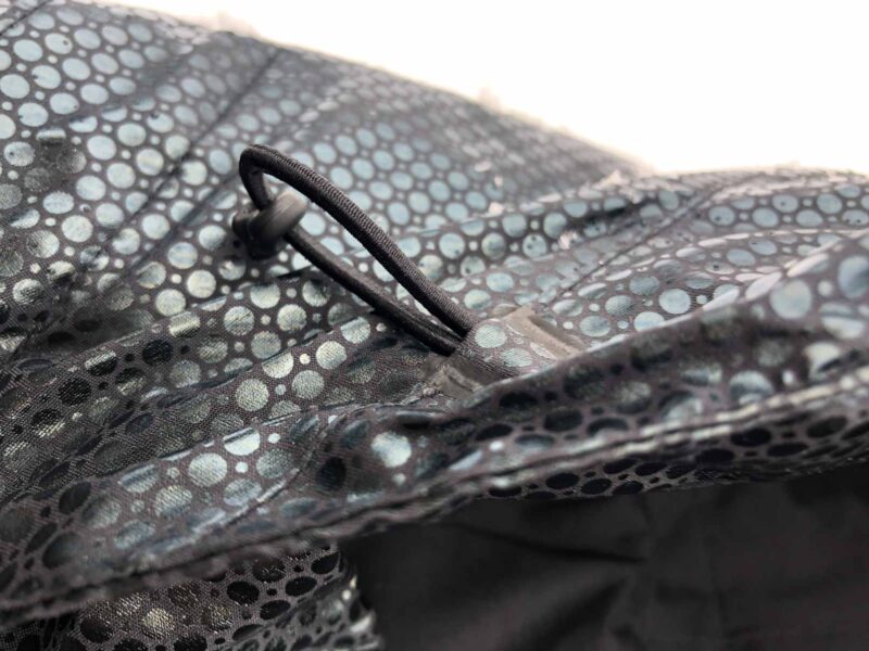 La capuche est amovible, elle possède un réglage en deux points basique (élastique). La vision latérale est correcte, sans plus. On retrouve le même type de boutons pression qu’aux poignets. Les boutons ont une fixation tellement puissante que l’on se demande d’ailleurs si le tissu ne va pas finir par céder…