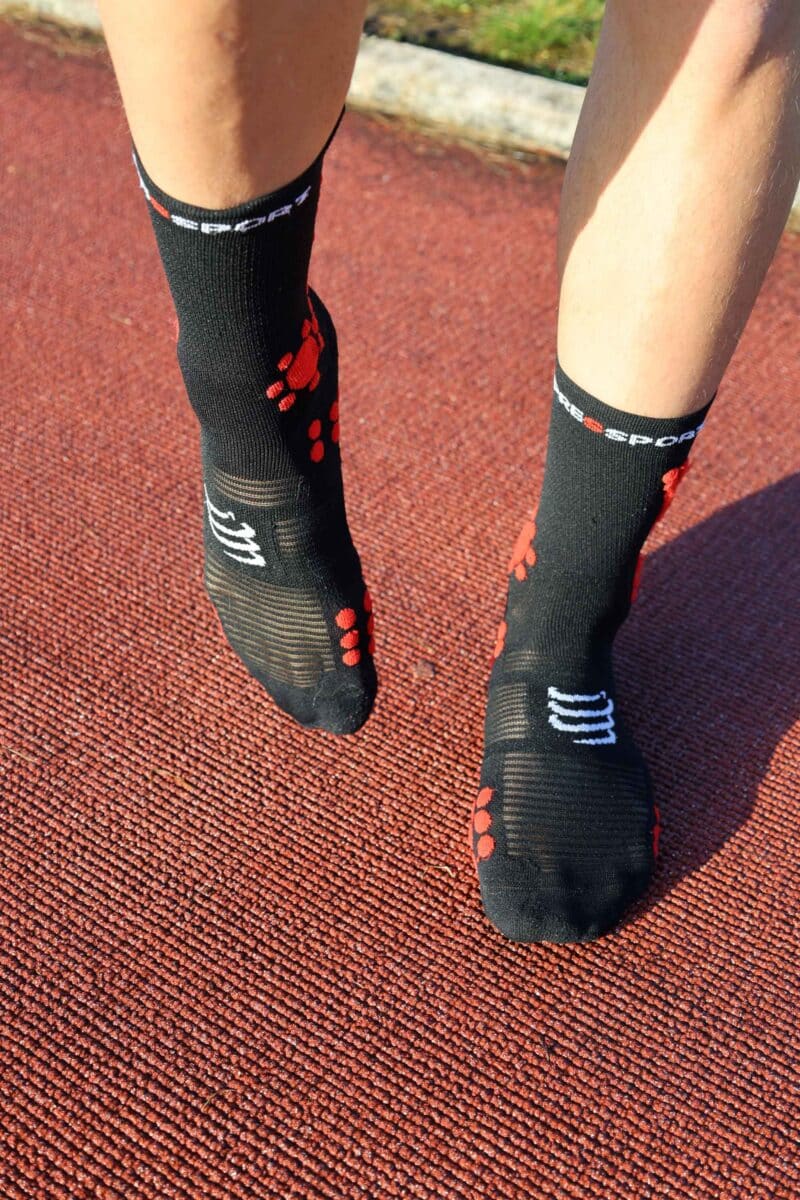 On a trouvé ces Compressport PRO RACING SOCKS V4.0 TRAIL hyper agréables à porter, en sortie trail pour la moitié du test. Elles sont d’un confort impressionnant, une absorption des (petits) chocs complétements validés, on a chaud, jamais froid au pied. Une légère transparence sur l’avant du pied permet une bonne respirabilité même si ce n’est pas son plus gros point fort.