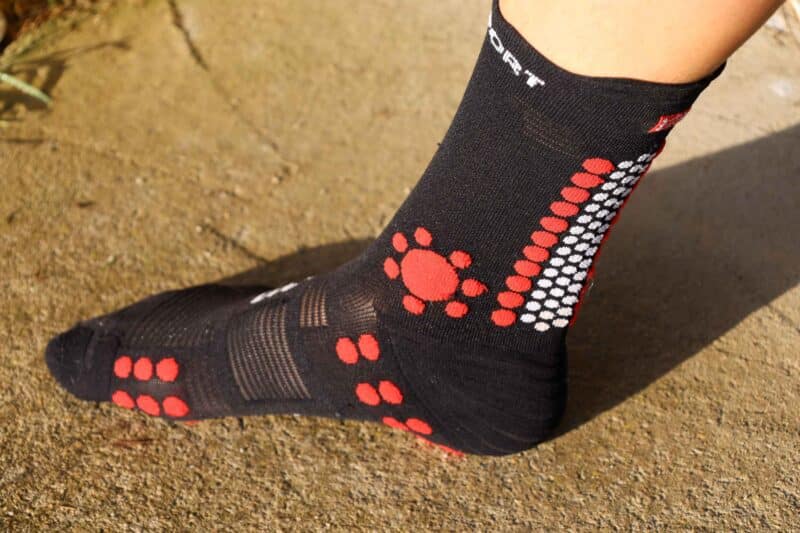 Le design est plutôt bien senti : c’est une chaussette semi haute, comportant des points 3D rouges sur le côté, derrière et dessous le pied ainsi que des points 2D blancs derrière la cheville.