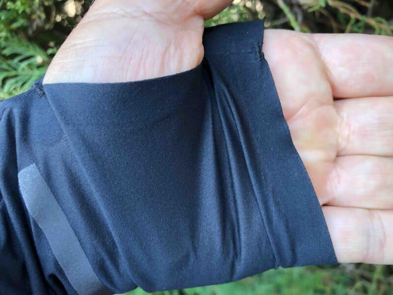 On a aimé la coupe qui protège bien le bas du dos, l’effet stretch dans les foulées, la capuche très enveloppante mais qui ne nuit pas à la visibilité latérale. Un bonnet ou un tour de cou peuvent se glisser dessous sans problème. Attention, le volume des bras est conçu pour de petits gabarits peu musclés dans cette zone. La manche gauche demande d’être étirée pour le passage des grosses montres GPS. Les passages pour les pouces permettent de protéger le dessus des mains. Le zip central coulisse bien. Le cou est très efficacement protégé. Le curseur de zip ne provoque pas de gène. Grand confort, douceur au niveau du contact avec la peau.