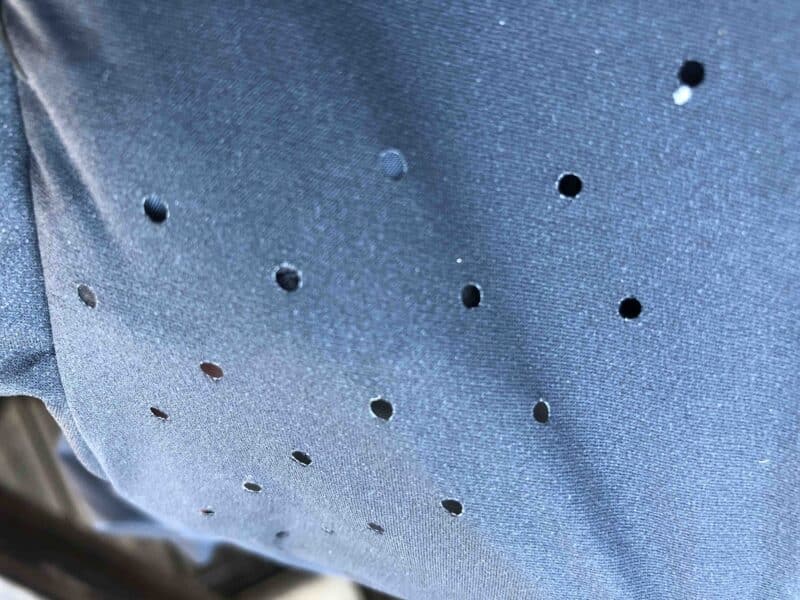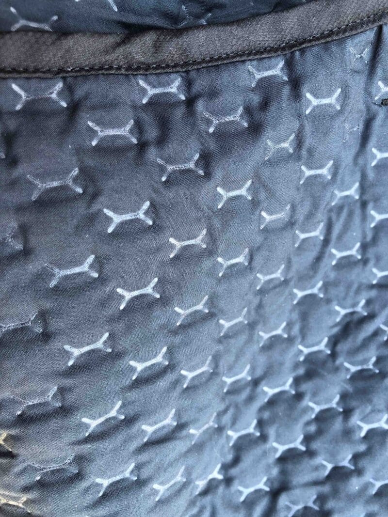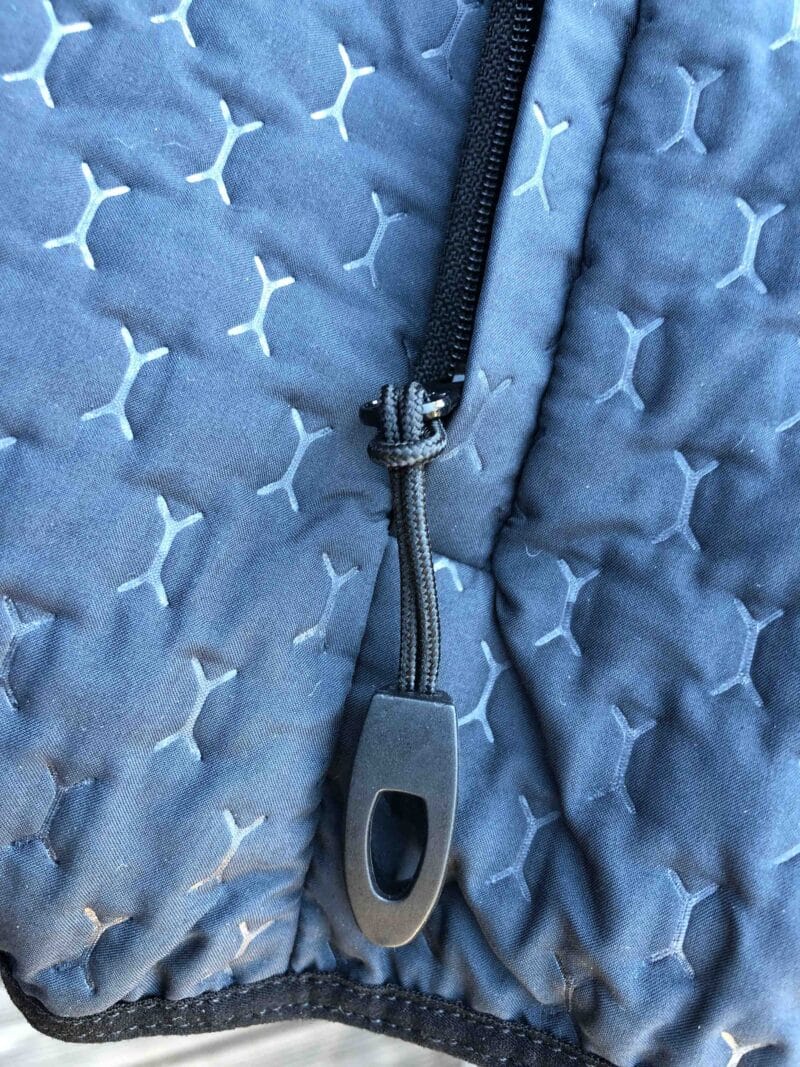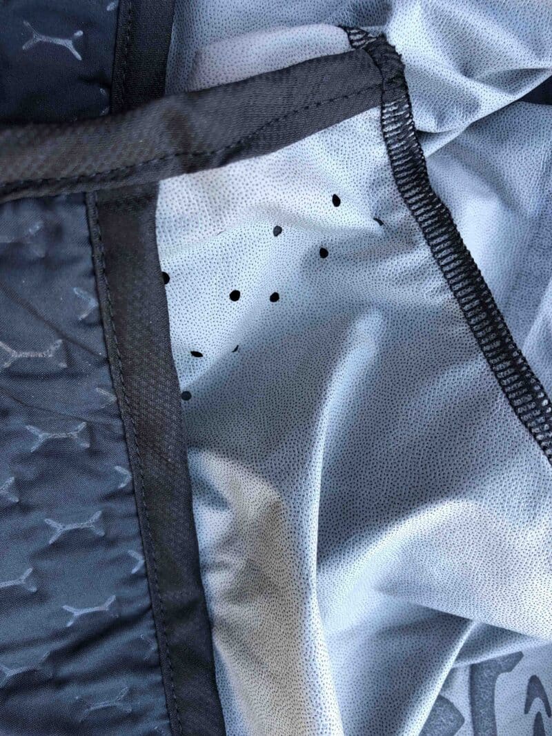 Elle n’est pas étanche mais déperlante. Elle se compose de deux parties : l’isolation proprement dite et la zone stretch des manches, des épaules et la partie supérieure pour respecter les mouvements. La particularité : les ouvertures, les « ouïes » dans le dos qui favorisent la ventilation. On se trouve bien en présence d’une veste pour effort d’endurance. L’isolation cantonnée à la moitié inférieure de la Compressport Winter Insulated 10/10 est fine : il ne faut pas s’attendre au rendement thermique d’une doudoune.