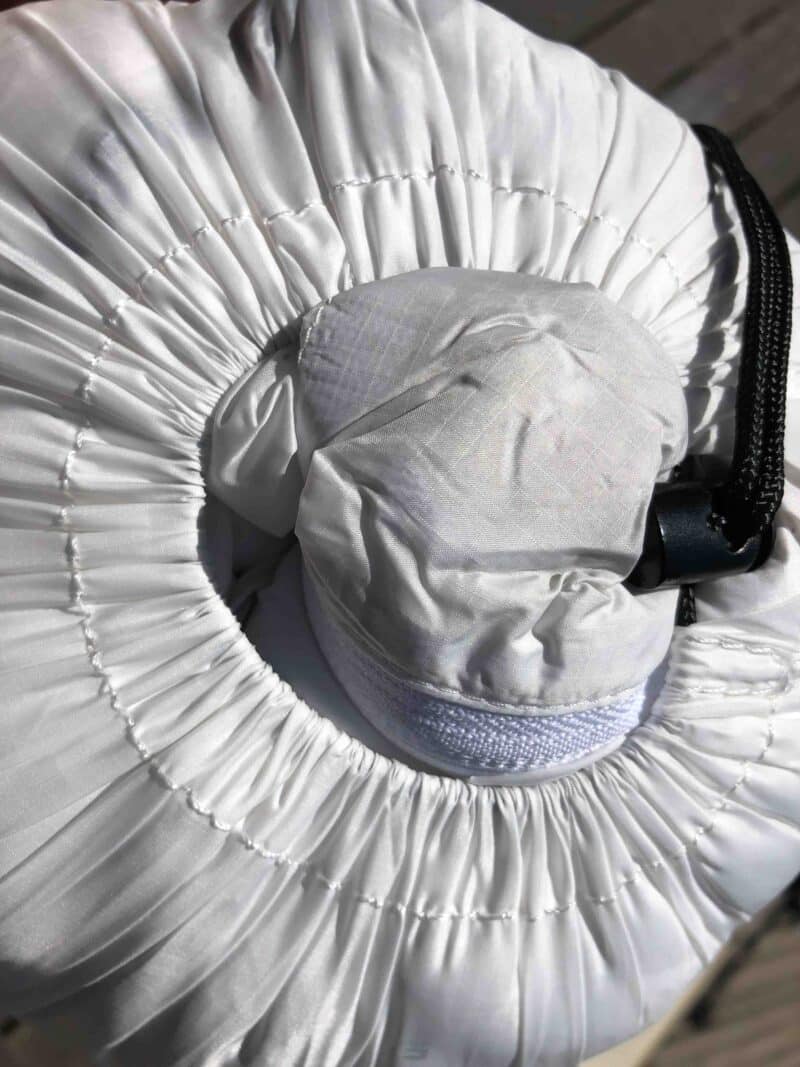 On note que le garnissage est plus important sur le dessus du corps que dans le dos. Le duvet pourrait être aussi un peu plus compartimenté pour éviter qu’il ne vienne se tasser aux extrémités des très longs caissons. Mais le Décathlon Forclaz MT 900 Minimal Editions est un sac qui doit contenir son poids avec peu de coutures et une architecture classique.