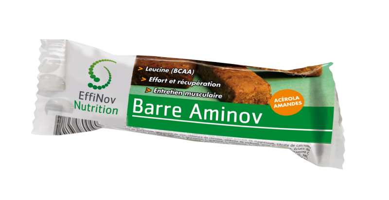 Cette barre diététique hyperprotéinée est destinée à être ingérée pendant l’effort et après pour préserver sa masse musculaire. Elle est constituée de protéines végétales, d’amandes, figues, abricot, acérola (cerise des Antilles, particulièrement riche en vitamine C) et de sirop d’agave.