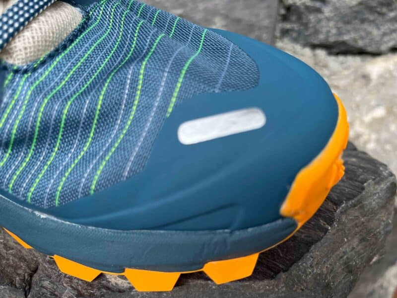 Le pare-pierres est fin mais suffisant pour le programme annoncé : chaussure polyvalente pour terrains pas forcément extrêmes. La souplesse au niveau de la toe box est conservée.