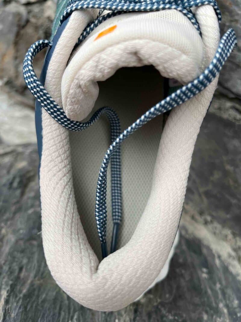 Les mousses de confort sont en effet très présentes sur l’enrobement arrière du pied. Elles sont très épaisses, on perd un peu en précision ce que l’on gagne en confort. Dans les passages très humides, ces dernières se chargent d’eau. En tout cas, le confort dans cette zone permet d’empiler les kilomètres sans problème.