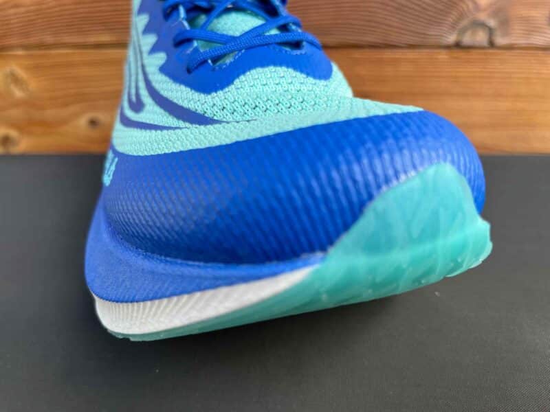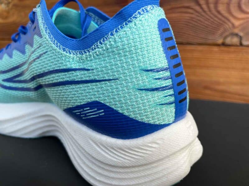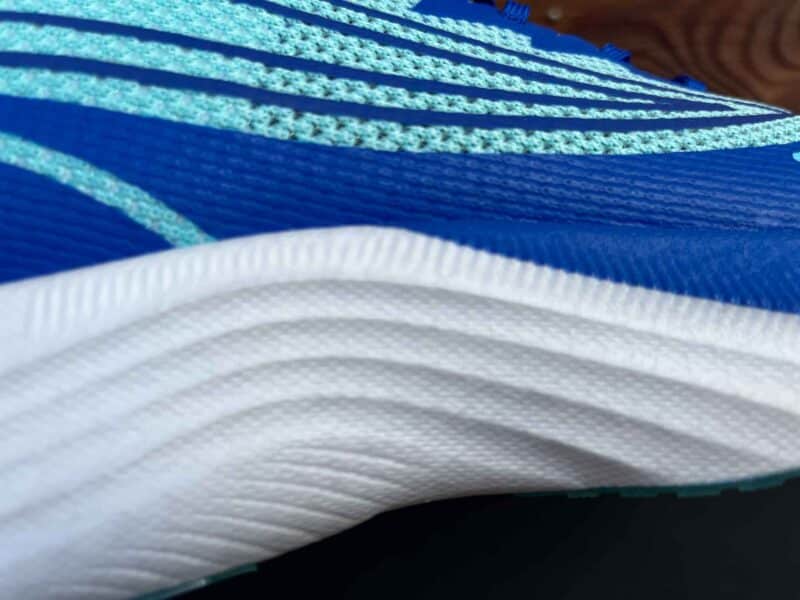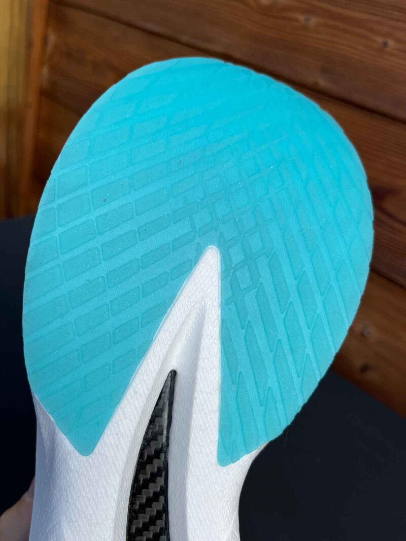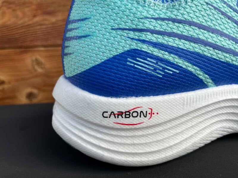 Nous avons pu la tester et découvrir cette chaussure très énergisée, dotée d’un bon basculement vers l’avant et d’un retour de « jus » enthousiasmants. Pas de doute, le rendement de la plaque carbone n’est pas un mythe, les accélérations sont puissantes ainsi que le rebond. On aperçoit une partie de la plaque carbone sous la semelle.
