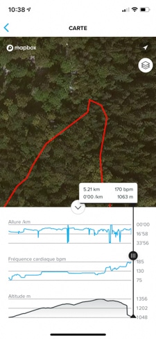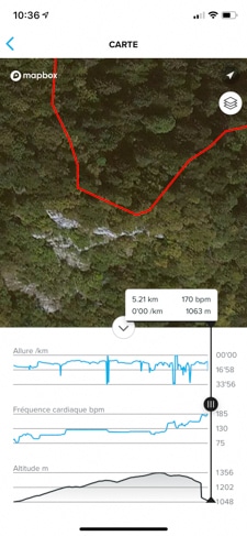 En matière de GPS, on note quelques erreurs. Au cours de cette sortie, nous avons suivi une barre rocheuse, la trace de la Garmin Swim™ 2 montre un passage du coureur dans le vide… Idem sur une piste forestière, la trace ne suit pas fidèlement l’itinéraire avec des hésitations latérales.