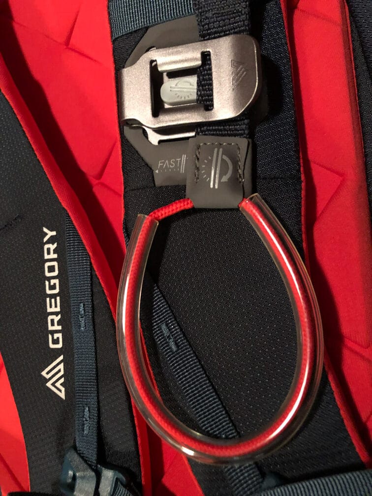 Effectivement, il suffit de glisser les talons du ski dans une boucle (qui se range dans un compartiment pour éviter de s’accrocher brutalement à une branche en forêt…). On redresse ensuite les skis verticalement. On saisit une sangle élastique dont l’embout se fixe sur la bretelle gauche du Gregory Targhee FT 35 afin de faire le tour du ski, le tour du sac avant de glisser à nouveau cette sangle dans le coinceur situé sur… la bretelle gauche. Sur le papier la manipulation est évidente, sur le terrain, elle demande un peu d’habitude et d’entrainement pour décaler les skis un peu sur l’arrière afin de n’être pas gêné par les fixations. Attention, si le portage est plutôt confortable grâce aux armatures semi rigides et légères du Gregory Targhee FT 35, on a tout de même une position verticale des skis avec des talons assez proches des pieds, notamment lorsque l’on grimpe des pentes verticales. Autre point, ce portage est efficace avec des skis de randonnée légers pour le litrage 35 mais moins convaincant avec des skis de freeride lourds équipés de grosses fixations : trop de poids latéral. Avec le volume de 45 litres, on peut plus facilement rééquilibrer les masses. En tout cas, ce système de portage Fasttrack est assez futé et rapide.