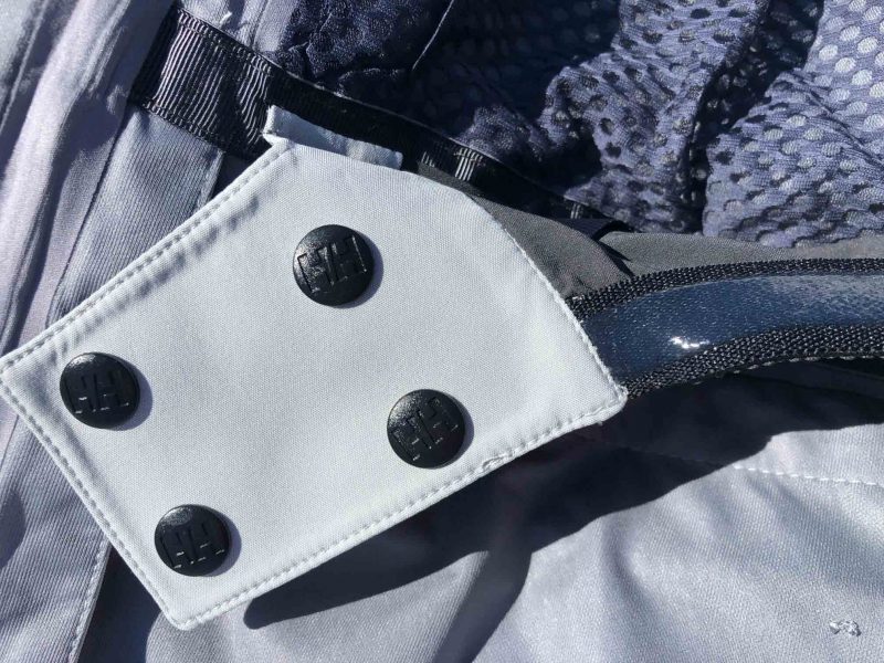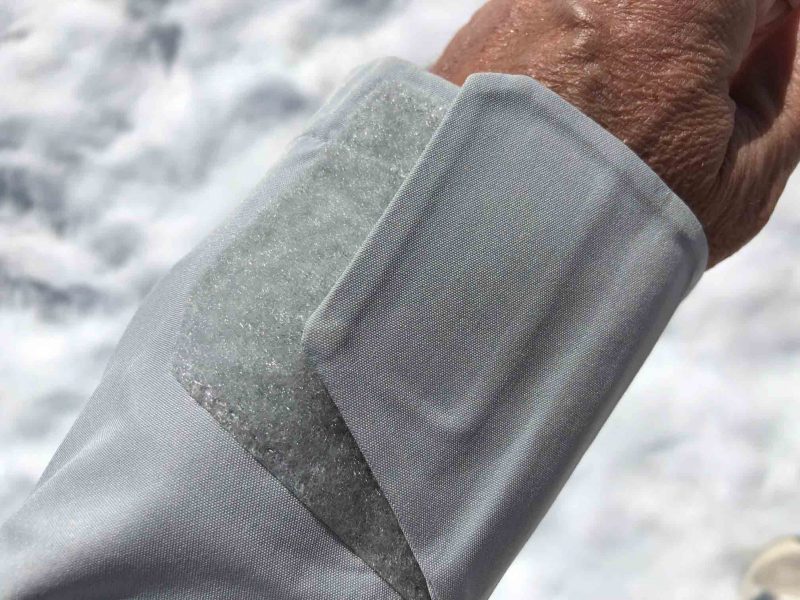 Nous avons beaucoup apprécié cette veste car, pour un usage freeride, tout tombe sous le sens. On sent que les moindres détails ont été minutieusement étudiés pour contribuer à une efficacité et une praticité maximales. Il ne faut pas s’attendre à des révolutions ou des innovations folles. Helly Hansen utilise des recettes éprouvées, en n’hésitant pas à rajouter sa touche. Un exemple : le velcro ultra large en poignet. Alors que la plupart des marques jouent le minimalisme dans cette zone avec des velcro fins, qui finissent d’ailleurs par ne plus accrocher avec la neige, Helly Hansen a pris le contre-pied. C’est très pratique d’utilisation car on attrape très aisément la patte de serrage avec le gant, on l’ajuste puissamment. On peut passer le tissu par dessus le gant ou si l’on a des gants « spécial poudreuse » qui remontent, ils passent par dessus la manche, d’autant plus facilement que le large velcro a plaqué le textile de la veste sur le poignet.