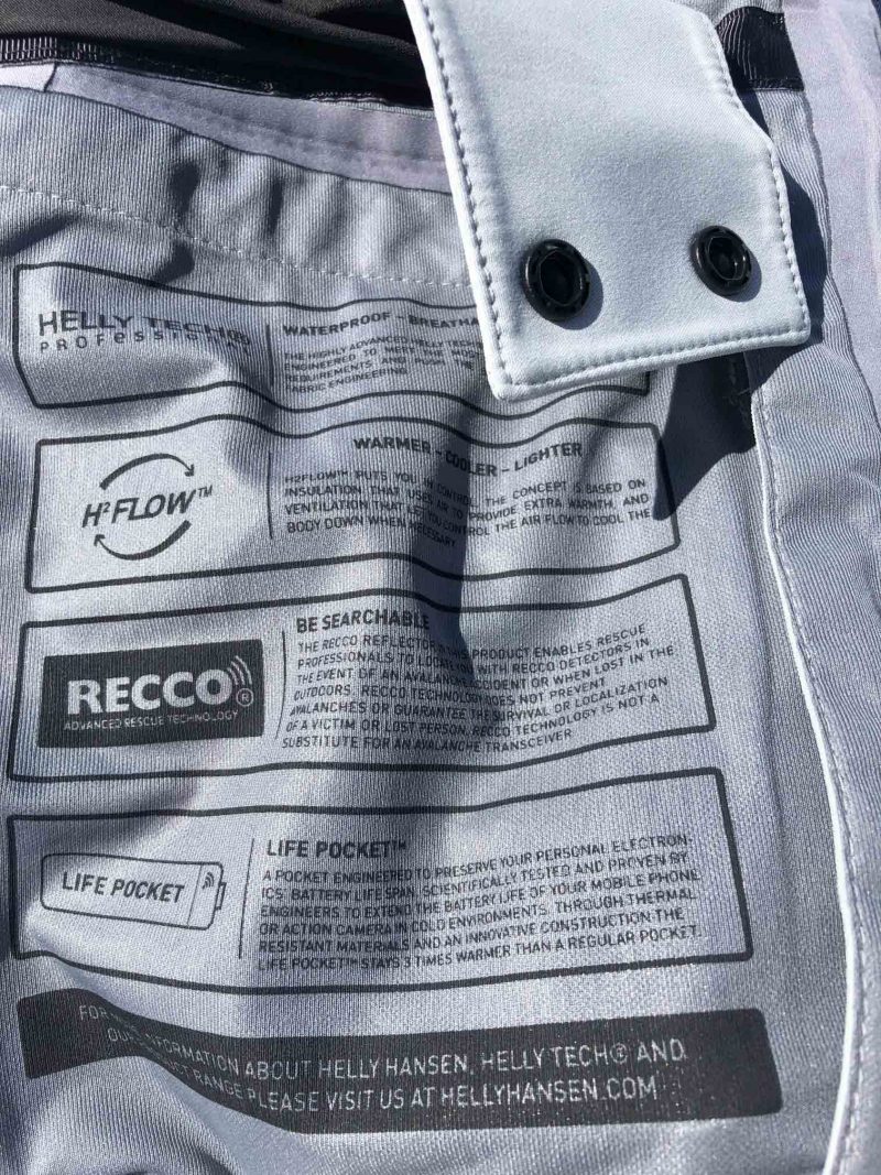 Curiosité, la poche pour le forfait ski est disposée sur le biceps. Ce n’est pas gênant. La Helly Hansen Ridge Shell 2.0 jkt est équipée du dispositif Recco de recherche de victimes d’avalanches. Attention, c’est un système passif et certaines stations ne sont pas équipées de détecteurs en possession des ski patrols… Le Recco est un plus mais en aucun cas l’assurance de s’en tirer face au risque d’avalanche.
