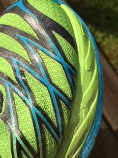 D’apparence massive, comme toutes les Hoka One One pourrait-on dire, la Clayton 2 n’est en aucun cas, dans son comportement, en accord avec son look extérieur. C’est d’ailleurs une chaussure mesurée dans son amorti contrairement à ce que pourrait laisser penser l’épaisseur de sa semelle. Il ne faut pas se laisser abuser par les rebords extérieurs de la semelle qui remontent très haut : le pied, à l’intérieur descend beaucoup plus bas et on se retrouve assez proche du sol. On garde donc de la précision et un excellent ressenti, principalement au niveau des métatarses. L’amorti est très bien dosé en médio pied : la chaussure relance, reste en contact avec les différentes surfaces des terrains. Elle est précise dans cette zone et permet un placement du pied efficace, ce que ne laissait pas présager son volume important au niveau de la toe box. Certaines chaussures de piste d’autres marques offrent cependant une plus grande précision en ce domaine. Pour autant, la Hoka One One est un choix pertinent quand les pieds gonflent et doivent dealer avec des fortes chaleurs (course sur route par exemple).