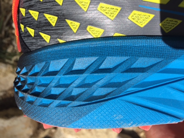 La Speed Goat 2 peut se courir en fore foot, on trouve alors une semelle réactive, qui relance, qui accroche en tout terrain grâce à son grip puissant. L’amorti est présent mais bien dosé pour aller vite. Dès que l’appui se diffuse vers l’arrière, on trouve un amorti présent en médio pied et très affirmé lorsque l’on se retrouve en talon. La semelle de la chaussure joue alors sur le plan antéro-postérieur ET latéral (dans une moindre mesure). On perd en précision ce que l’on gagne en filtration. L’énorme avantage de ce matelas douillet, c’est de pouvoir attaquer comme un fou à la descente sur un lit de cailloux : on ne sent rien, la chaussure absorbe et on ne subi pas de remontée de terrain. Le désavantage : c’est de perdre de l’énergie si l’on est mal placé à cause de cet amorti. Si on la courre « juste », la Hoka est très agréable et s’avère performante en trail.