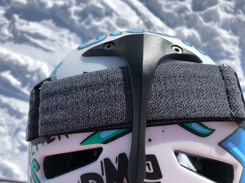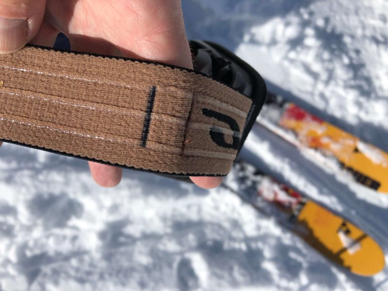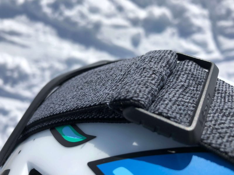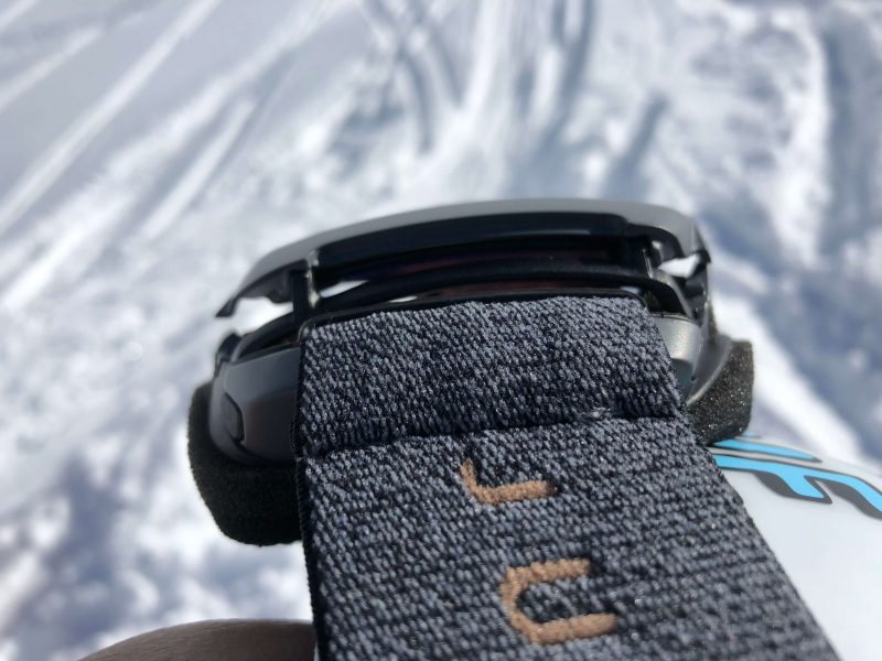 Le strap de serrage n’est pas très large mais reste efficace. Comme il est d’usage, il possède les incontournables bandes de silicone antiglisse pour le positionnement sur le casque. Les deux boucles plastique pour le réglage de la longueur sont plutôt agressives pour les doigts et le strap ne coulisse pas facilement.