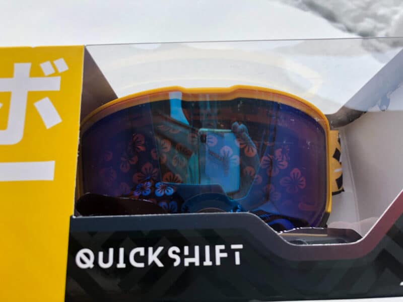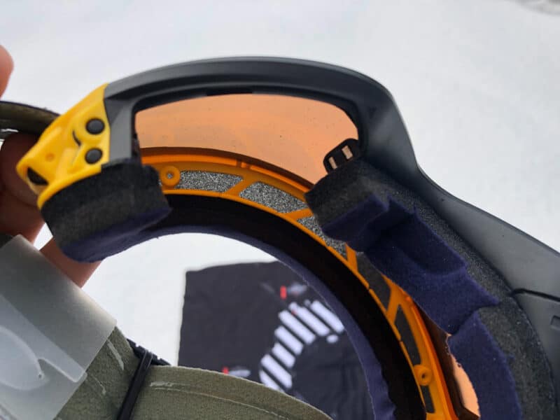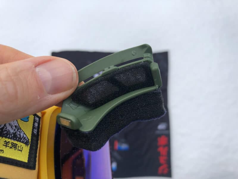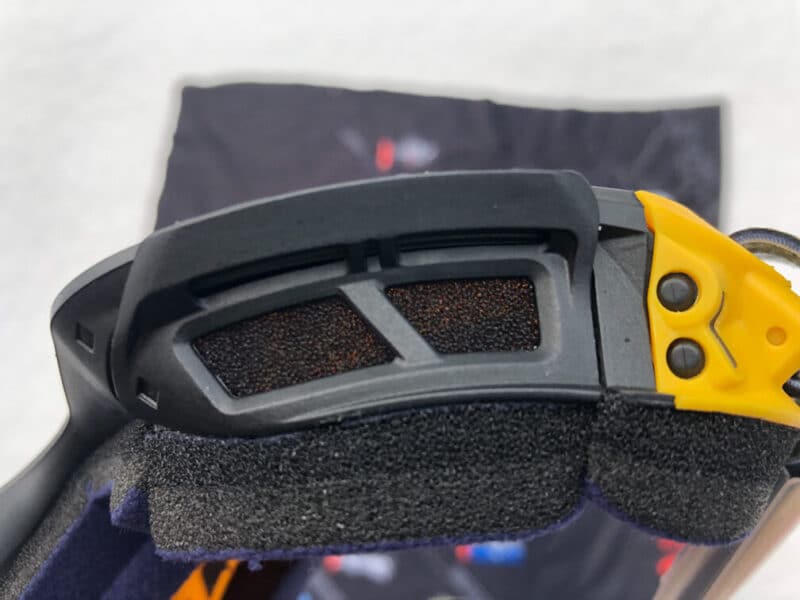 Le Julbo Quickshift Yotei possède donc une particularité : le Switch Air System. Il s’agit de deux pièces amovibles à la base de la monture. Une fois retirées, on a une grande circulation d’air dans le masque, une configuration utile en randonnée ou freerando si l’on ne veut pas conserver son masque sur le visage et ne pas sortir de solaires. Le système est assez bien pensé, les deux pièces se retirent facilement car elles sont montées sur deux petits aimants. La manipulation se fait en un clin d’œil. Remettre la partie amovible s’effectue tout aussi facilement.