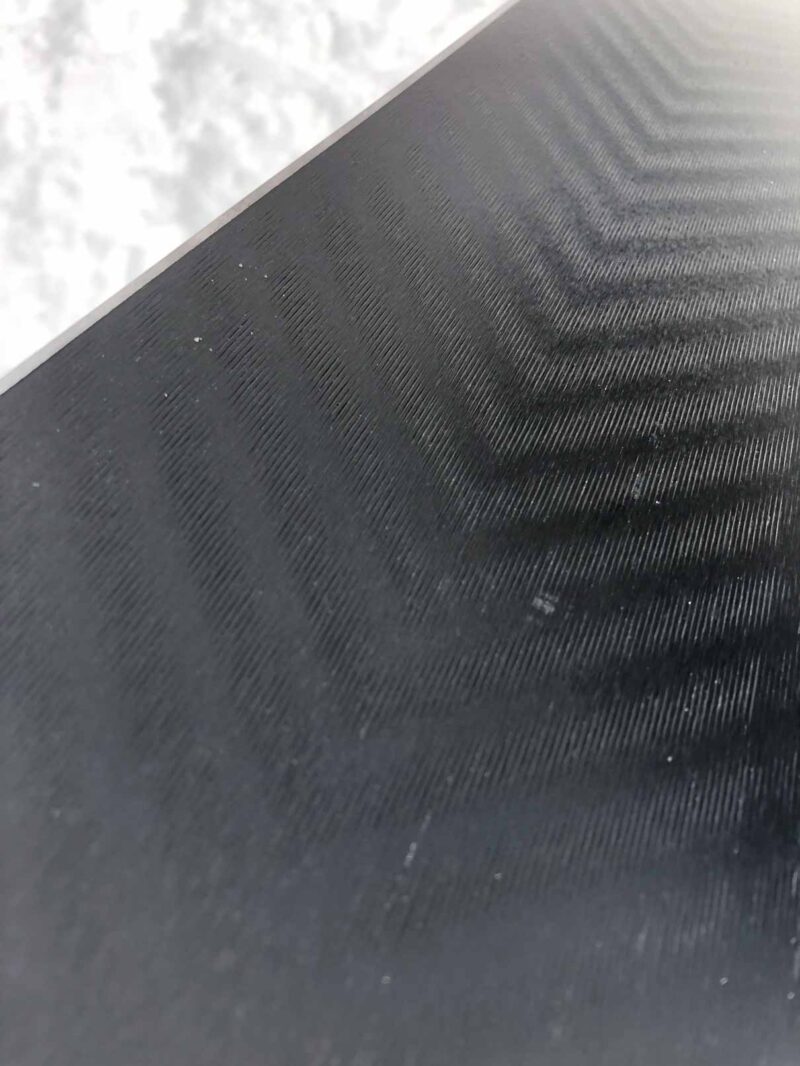 La semelle est magnifique, très bien structurée, elle offre une super glisse. De manière générale, les finitions sont très bonnes. On note le bel insert métallique, la présence de carbone en spatule. C’est un magnifique objet pas spécialement lourd sous le pied (malgré ses 1859 grammes), au prix élevé.