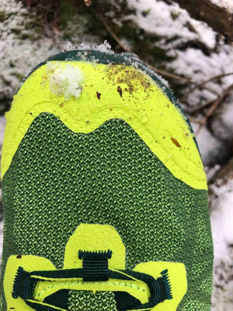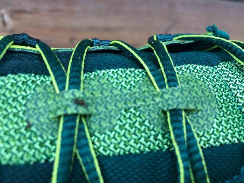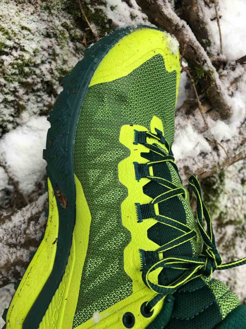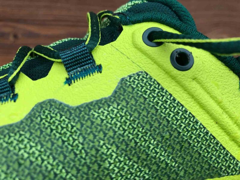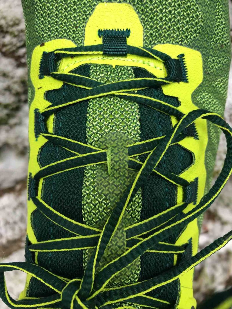 Le laçage a été qualifié de « puissant », rien ne bouge, il faut simplement faire un double nœud au lacet semi plat ou ovale. Attention à bien positionner le sommet de la languette qui dérive un peu dans cette zone. Les deux œillets métalliques peuvent provoquer une légère pression selon l’angle de la cheville (ne pas trop tendre le lacet). Le matériau est assez rigide car il transmet la tension du lacet.