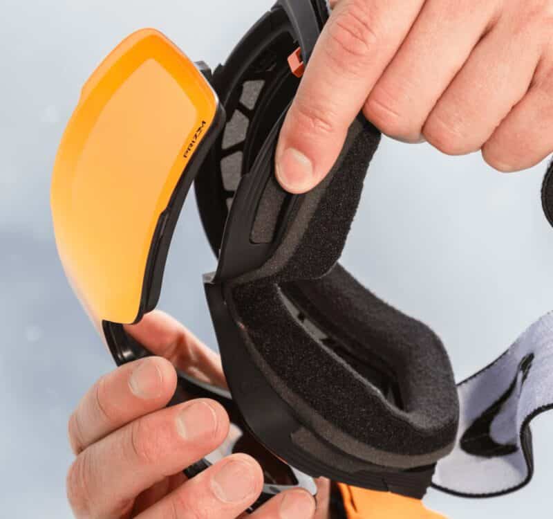 Alors que certaines marques comme Smith jouent la carte d’une fixation magnétique, Oakley, sur le Line Miner Pro L ajoute aux six aimants, deux verrous mécaniques afin d’éviter tout décrochage intempestif de l’écran. Le système est efficace et relativement pratique. Il suffit de pousser un bouton rouge disposé à la base du bandeau pour décrocher l’écran et le remplacer. Attention, quand on place le nouvel écran, ne pas mettre ses doigts dessus, on préconise d’utiliser l’étui textile pour le protéger.