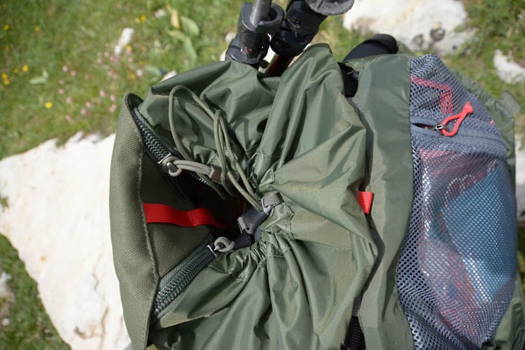 Le rabat supérieur du sac est de taille bien adaptée pour du petit matériel rapidement accessible avec un zip extérieur, et une poche filet à l’intérieur.