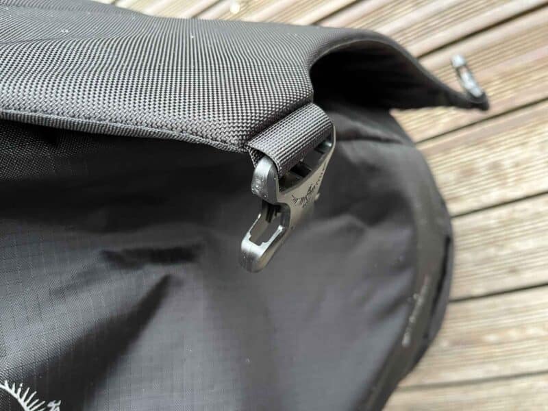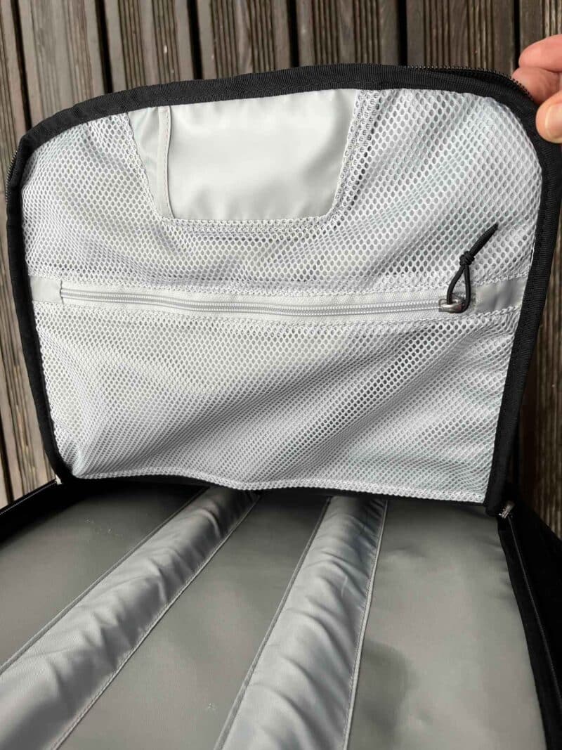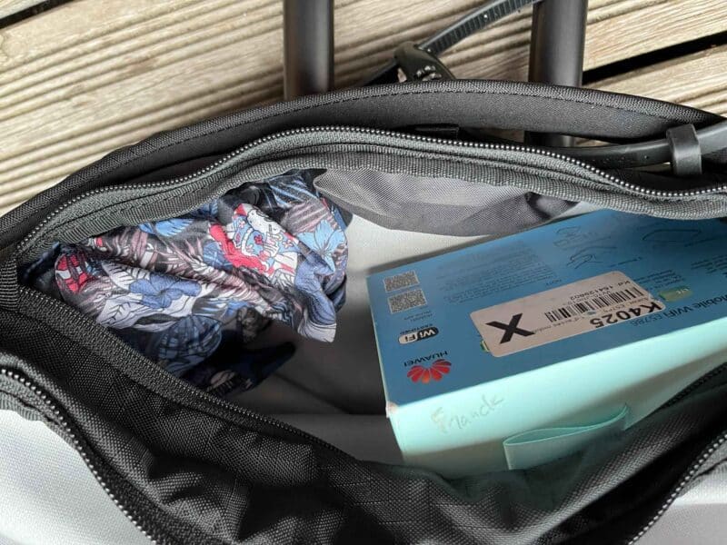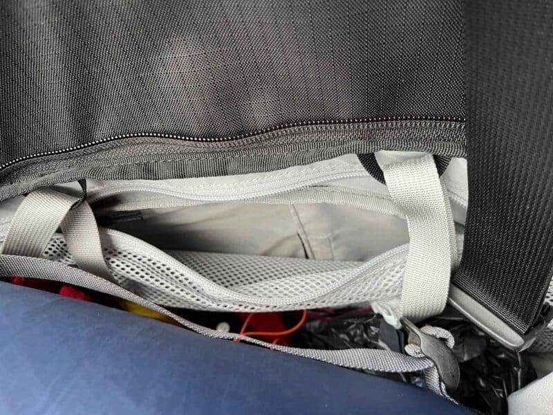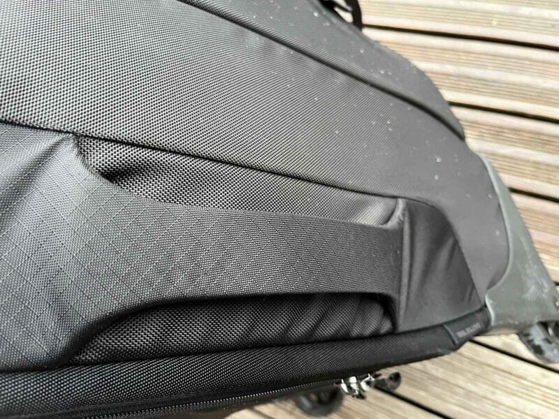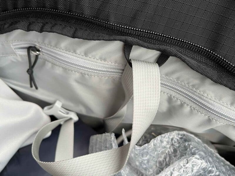 Les compartiments de rangement sont nombreux, tous zipés. Un détail particulièrement bien vu : les sangles de compression internes sont tenues au sommet du sac par de petites boucles : ça évite qu’elles ne se retrouvent, comme souvent, sous le contenu du sac au moment de la fermeture !