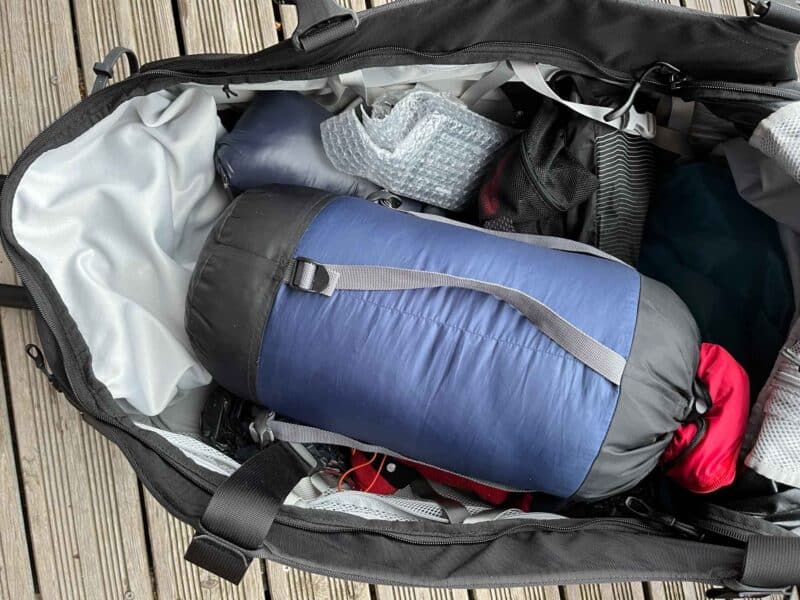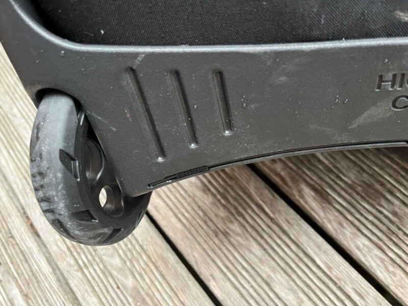 L’autre caractéristique de ce Osprey Sojourn Shuttle Wheeled Duffel 100 L est sa capacité de rangement. Annoncé à 100 litres, il en fait un peu plus, 108 exactement. Son volume est à géométrie variable avec un système de sangles internes et surtout des parois souples mais rembourrées sur les côtés (StraightJacket) : des sangles larges permettent de varier le volume. La capacité de ce sac est au final très impressionnante ! Il faut vraiment notre que ce Osprey, très gros, ne pèse pas grand-chose. Pourtant la marque n’a pas rogné sur la qualité, tout au plus, peut-on remarquer de légères marques de frottements sous le sac, dans sa partie supérieure.