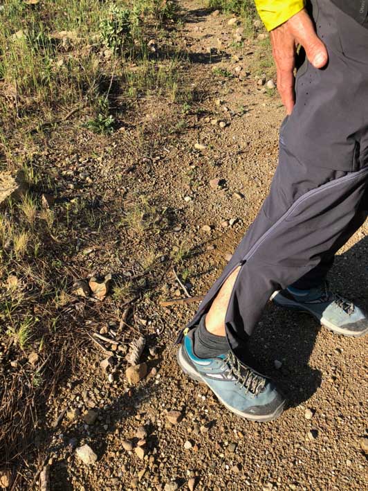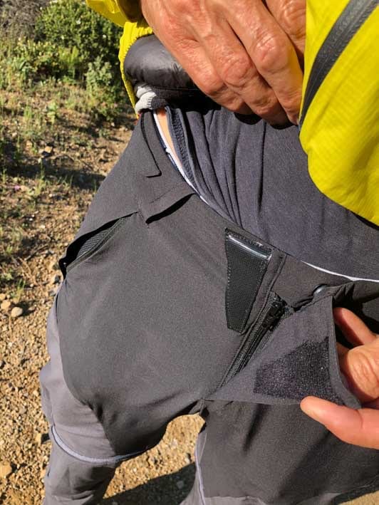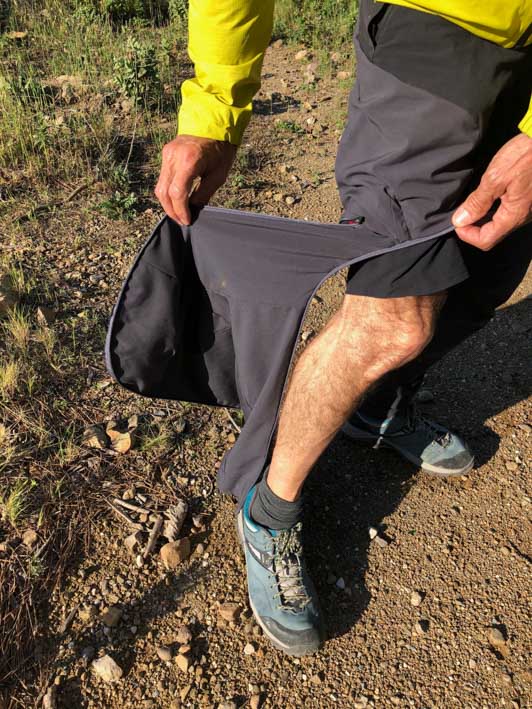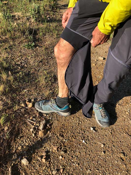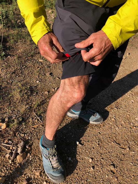 Venons-en maintenant à ce qui fait vraiment la particularité de ce pantalon : sa faculté à se transformer en un éclair, d’un simple tour de main, en short. Le principe est celui d’un Zip enroulant et fixe qui part du genou autour du mollet et jusqu’à la cheville. C’est d’une simplicité et d’une efficacité déconcertante. Et même pas besoin de poser ses chaussures ! Les parties basses se replient ensuite dans deux poches latérales dédiées, et vous voilà en short.