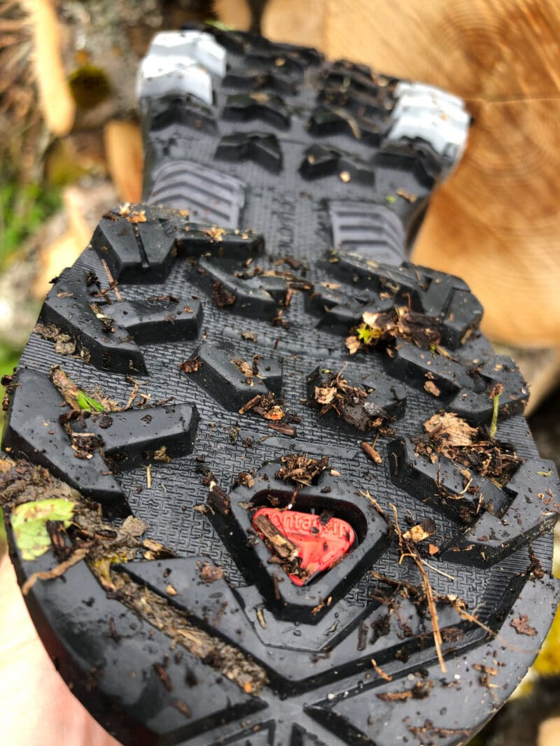 On ne sent pas les remontées de cailloux et le grip de la semelle est bon dans la plupart des configurations. Elle ne sature pas sur toute la partie avant et garde un peu de boue en talon (sous la cheville) mais rien de bien gênant. Équipée d’une membrane Gore-Tex, elle gagne en étanchéité (très agréable) ce qu’elle perd en respirabilité.