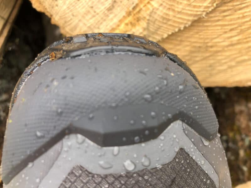 On a aimé la précision de la pose au sol qui est quasi équivalente à celle d’une chaussure de trail running. Le contact est direct, on l’a déjà dit, l’amorti est absent pour une plus grande précision. La rigidité en torsion est bien dosée, elle permet d’évoluer en terrain en dévers avec sureté mais en gardant de la proprioception. Le déroulé est agréable, on sent que c’est plus rigide qu’un modèle de trail mais ça permet de tenir sur de longues sorties techniques éventuellement avec un sac à dos.