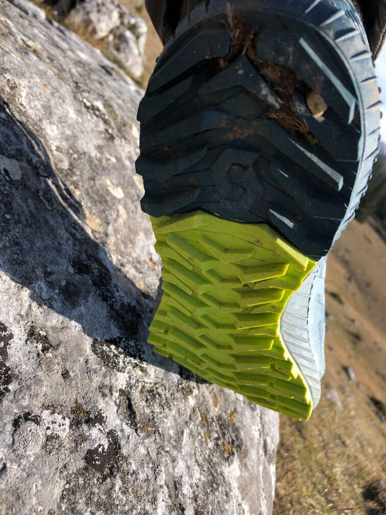 La gestion de la torsion est correcte, comme le déroulé. La semelle offre un grip puissant dans les terrains humides, attention aux dalles où selon le rocher, elle peut perdre de son mordant (calcaire poli par exemple…). Elle conserve également les petits cailloux qui restent coincés.