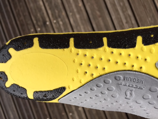 La semelle interne d’apparence classique possède pourtant de multiples inserts pour favoriser l’appui au niveau des métatarses et le maintien de la plante des pieds. Nous n’avons pas eu besoin de customiser cette zone pour ajuster la chaussure.