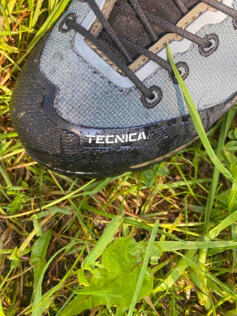Sur l’avant de la Tecnica Sulfur S GTX MS une zone en caoutchouc offre une protection supplémentaire sur l’ensemble des orteils contre les chocs, l’abrasion des rochers.