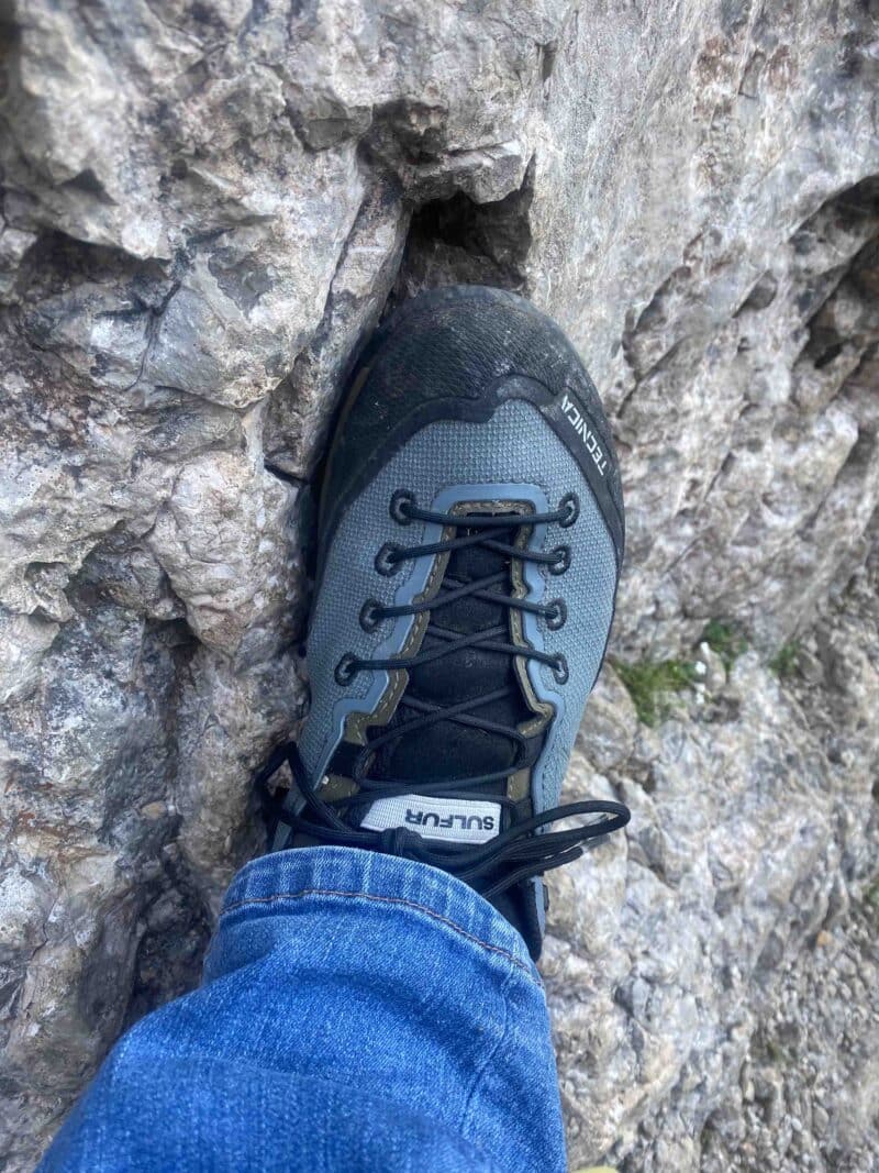 L’un des points fort de cette Sulfur S GTX MS de Tecnica est sans aucun doute sa semelle. Son revêtement Vibram Megatrip est très efficace lors des escalades en rocher, et particulièrement en dalle. Son adhérence et sa souplesse rendent cette chaussure plus sure et précise. Au milieu de la semelle extérieure se trouve « l’arch grip », une partie en caoutchouc crantée se trouvant sous la voute plantaire et permettant d’avoir une meilleure accroche dans des situations particulières type arête rocheuse, poutre bois en accro branche, barreaux d’échelle en via ferrata ou même en neige dure…