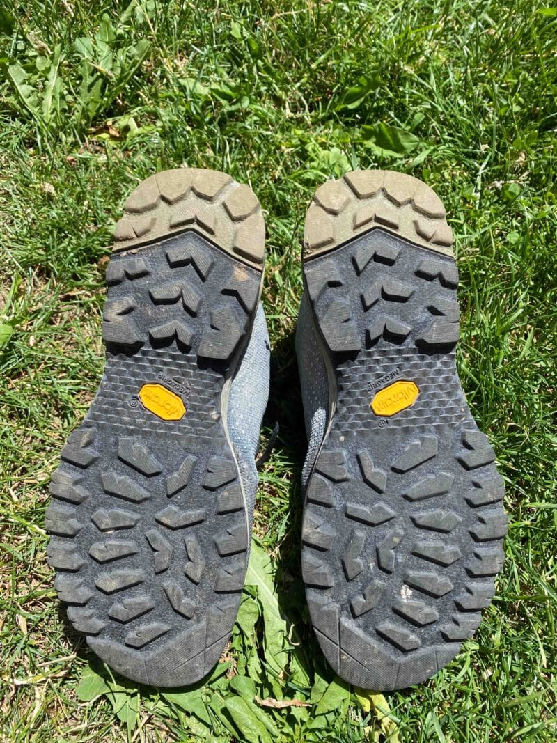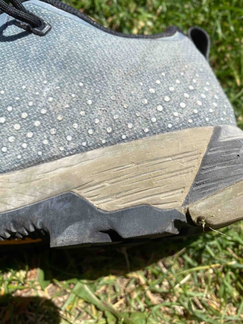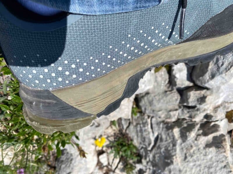 La semelle intermédiaire est composée de deux zones de densités différentes. Du côté de la techno : Edge Frame, une plaque en TPU insérée au milieu de la chaussure, on a des sensations d’amorti. La marche est souple et agréable, le dérouler du pied s’effectue de manière naturelle et sans effort. Lorsque la pente se redresse et que l’escalade devient obligatoire, l’ensemble semelle/plaque donne de bons appuis grâce à une rigidité bien dosée. Nous avons pu remarquer quelques dégradations sur la partie semelle intermédiaire sur le côté, la partie plus souple.
